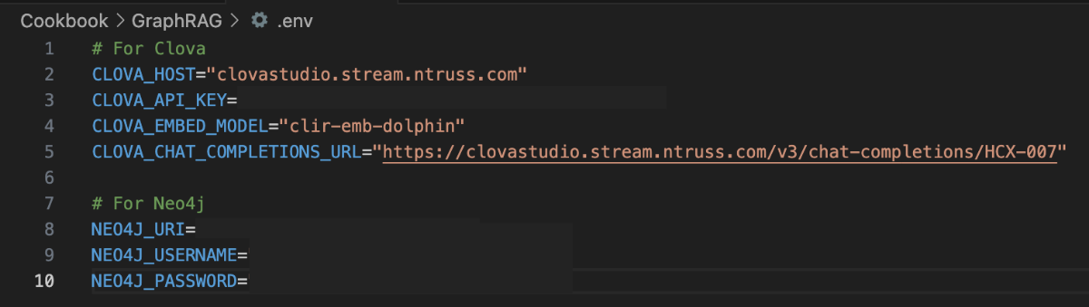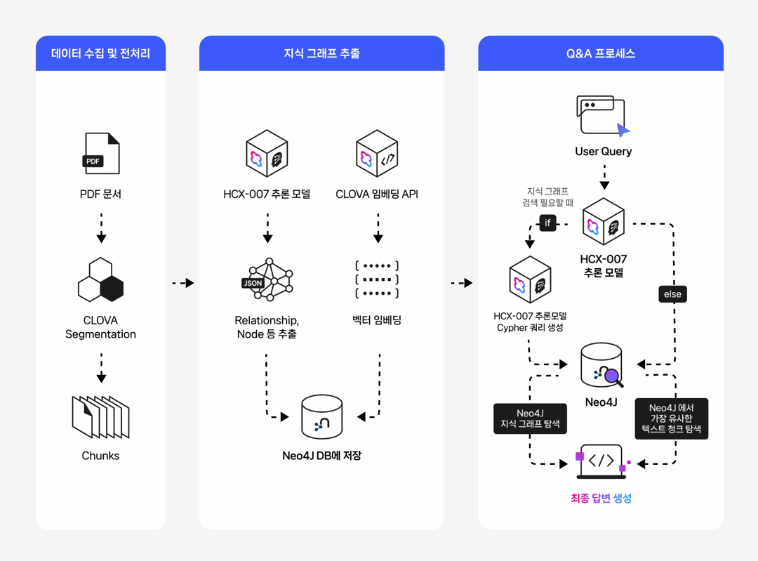 들어가며 작성 배경 및 목적 실무 환경에서는 데이터 간의 복잡한 관계를 탐색하거나, 결과에 대한 명확한 근거 제시가 필요하거나, 여러 단계를 거친 추론이 요구되는 질의가 자주 발생합니다. 본 문서는 이러한 복합 질의 상황에서 전통적인 벡터 기반 RAG(Retrieval-Augmented Generation)의 한계를 보완하기 위해, 데이터의 구조적 관계를 활용한 GraphRAG 파이프라인 구축 방법을 제시합니다. 이를 위해 클로바 스튜디오의 HCX-007 추론 모델과 그래프 데이터베이스 Neo4j를 활용하여 PDF 데이터로부터 지식 그래프를 구축하고, 이를 기반으로 한 Structured Q&A와 기존 Vector Q&A 방식을 결합한 하이브리드 질의응답 시스템의 구현 과정을 다룹니다. GraphRAG와 Neo4j는 무엇인가? ① GraphRAG: '관계 지도'를 활용하는 차세대 AI 검색 기존 RAG는 사용자의 질문과 의미가 비슷한 텍스트를 찾아 LLM이 참고하도록 하는 방식입니다. 이 방식은 해당 페이지 내의 정보에는 강점을 보이지만, 여러 문서에 흩어져 있는 개념 간 관계를 종합적으로 추론하는 데에는 한계가 있습니다. GraphRAG는 이러한 한계를 넘어, Neo4j에 구축된 지식 그래프(relationship graph)를 함께 활용합니다. 즉, 모델이 참고하는 것은 단순한 텍스트 조각이 아니라 데이터 간의 연결 구조 전체입니다. 이를 통해 개별 정보의 의미뿐 아니라 엔터티 간의 관계를 함께 이해하고, 여러 출처의 데이터를 맥락적으로 통합하며, 보다 정확하고 신뢰할 수 있는 답변을 생성할 수 있습니다. ② Neo4j: 데이터의 관계를 저장하는 데이터베이스 데이터베이스는 대개 정보를 엑셀 시트와 같은 표 형태로 저장합니다. 이 방식은 단순한 데이터를 다룰 때는 효율적이지만, 데이터가 복잡해질수록 구조가 복잡해지고 처리 속도가 떨어집니다. Neo4j는 이러한 한계를 보완하기 위해, 데이터를 관계 중심으로 표현하는 그래프 데이터베이스(Graph Database)입니다. Neo4j는 이러한 접근 방식 대신 데이터를 관계 중심으로 모델링하는 그래프 데이터베이스(Graph Database)로, 복잡한 개체 간의 연결을 노드(Node)와 관계(Relationship) 형태로 자연스럽게 모델링하고 저장합니다. Neo4j는 데이터를 노드와 관계로 표현해 복잡한 연결 구조를 직관적으로 다룰 수 있습니다. 이런 그래프 기반 구조는 데이터를 빠르고 효율적으로 탐색할 수 있게 해주며, 스키마가 고정돼 있지 않아 새로운 속성이나 관계도 쉽게 추가할 수 있습니다. 또, 그래프 구조에 최적화된 Cypher 쿼리 언어를 지원해 복잡한 질의도 간결하게 작성할 수 있습니다. ③ 온톨로지: 지식 그래프의 설계도 GraphRAG의 성능을 높이기 위해서는 온톨로지(Ontology) 개념이 중요합니다. 온톨로지는 특정 도메인(예: 금융, 의료, 제조 등)의 지식을 체계적으로 표현하기 위한 규칙과 어휘의 집합으로, 지식 그래프의 설계도이자 스키마 역할을 합니다. 온톨로지에서는 어떤 종류의 개체가 존재하는지, 각 개체가 어떤 속성을 가지는지, 그리고 개체 간에 어떤 관계가 가능한지를 미리 정의합니다. 예를 들어 ‘인물’, ‘회사’, ‘프로젝트’ 같은 개체가 있고, 인물은 이름과 직책이라는 속성을 가지며, 회사에 소속되거나(WORKS_FOR) 프로젝트를 관리하는(MANAGES) 관계를 맺을 수 있습니다. Neo4j가 흩어진 정보를 연결해 ‘관계 지도’를 만든다면, 온톨로지는 그 지도에 쓰인 기호의 의미와 규칙을 정의하는 범례 역할을 합니다. GraphRAG은 이 지도와 범례를 함께 활용해 복잡한 질문에 대해 신뢰도 높은 경로를 찾아냅니다. GraphRAG은 복잡한 관계를 기반으로 한 질의나 설명 가능한 추론이 필요한 환경에서 특히 유용합니다. 예를 들어 기업 조직도나 공급망처럼 개체 간 연결이 많은 구조를 분석하거나, 금융·의료·법률 분야처럼 근거 자료의 추적이 필요한 경우에 적합합니다. 또한 여러 단계의 논리적 연결을 따라가야 하는 복합 질의나, 이미 도메인 지식이 체계화된 산업군에서도 효과적으로 활용할 수 있습니다. 대표적인 활용 분야 금융/리스크/사기 탐지 : 거래 기록, 구성원, 회사 네트워크의 연관성을 분석한 위험 탐지 및 의사결정 법률/규제 : 조문·판례 간의 연결 관계를 활용한 사례 연구 및 근거 탐색 기업 내부 지식/연구 : 다양한 문서·연구자·프로젝트 간 연계를 통한 인사이트 도출 및 지능형 Q&A 고객 서비스 : 복잡한 문의에 대해 근거 기반의 신뢰성 높은 답변 제공 GraphRAG에 HCX-007 추론 모델을 사용해야 하는 이유 GraphRAG에 추론 모델을 사용하는 이유는 그래프 구조 속 관계적 의미를 정확히 이해하고 해석할 수 있기 때문입니다. 1. 뛰어난 추론 및 지시 이행 GraphRAG은 문서에서 엔터티와 관계를 추출해 그래프 형태로 저장합니다. 하지만 단순히 텍스트 유사도를 계산하는 방식만으로는 노드 간의 복잡한 연결이나 간접적인 의미 관계를 충분히 드러내기 어렵습니다. HCX-007 추론 모델은 이러한 한계를 넘어, 여러 노드 사이의 맥락적 연결을 이해하고 문장에 드러나지 않은 논리적 관계를 찾아낼 수 있기 때문에 더 풍부하고 정교한 응답을 제공합니다. 2. 신뢰성 있는 답변 생성 HCX-007 추론 모델은 단순히 답변을 제시하는 데 그치지 않고, 답이 도출된 과정을 함께 보여줄 수 