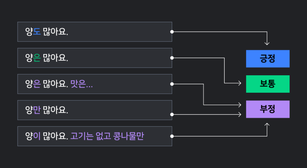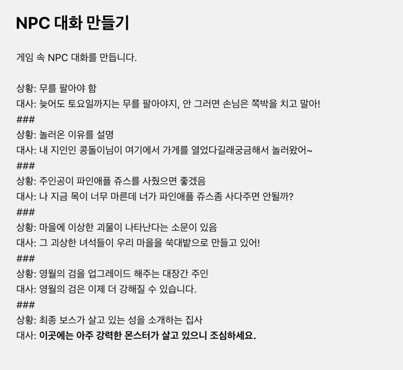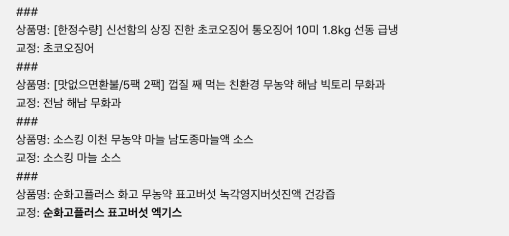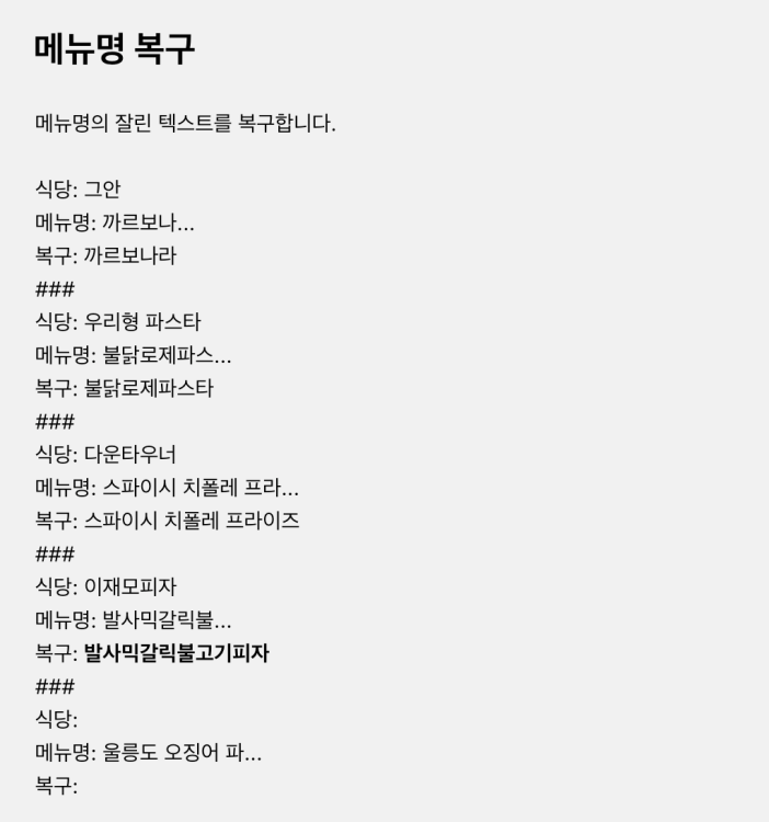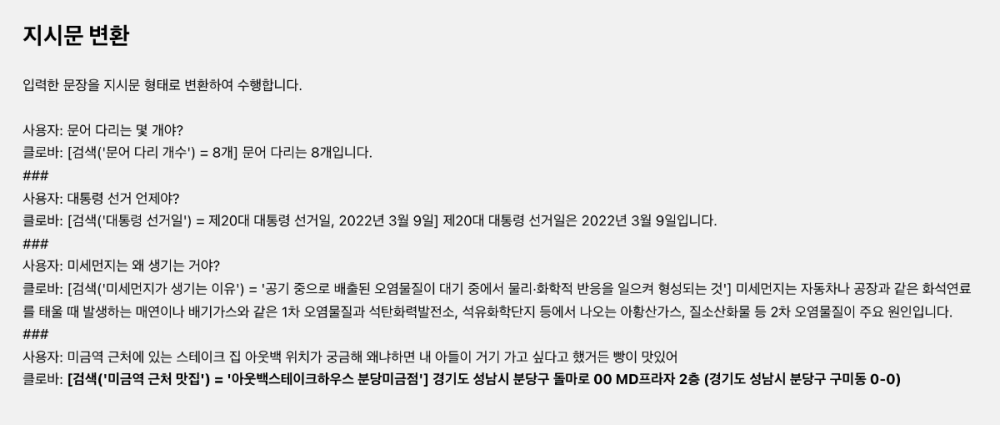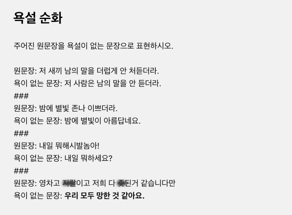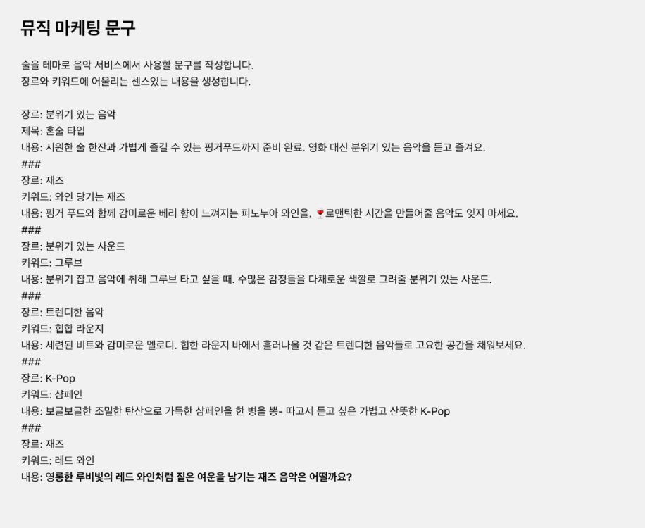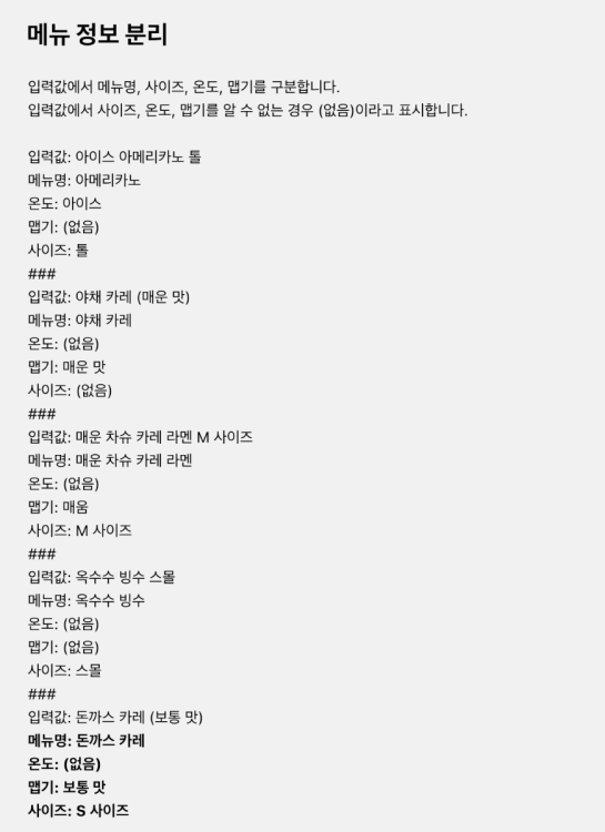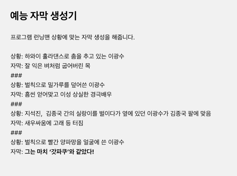품질을 높일 수 있는 작은 차이 하이퍼클로바 스튜디오로 작업을 하다 보면 기대하던 결과가 나오지 않을 때가 있어요. 특히, 분류, 교정처럼 정답을 알 수 있는 작업의 경우 더욱 그렇죠. "예제를 넣었는데도 왜 그럴까요?" 우선 Instruction이 적절했는지 점검해볼 필요가 있습니다. Prompt는 선생님이 학생에게 알려주듯이 문법적인 오류나, 설명의 오류 없이 구체적이고 정확하게 작성을 하는 것이 좋습니다. 제가 하이퍼클로바를 다루면서 얻은 비결은 예제를 무조건 많이 넣어주기보다는 모델이 패턴을 파악할 수 있도록 알려주는 게 효과적이었다는 것입니다. 다음은 입력값을 다양한 특징으로 분류하는 작업입니다. ▲ 돈까스 카레 (보통 맛)을 입력 후 실행하면, 메뉴명: 돈까스 카레, 맵기: 보통 맛으로 분류를 합니다. 그런데 S 사이즈라고도 출력을 했는데, 이건 입력값에 없는 정보죠. ▼ 이 경우에 사이즈는 (없음)이라고 수정을 하여 모델에게 알려줍니다. "너 이럴 땐 이렇게 해야 하는 거야"라고 알려주듯이 말이죠. ▼ 이제 잘 되는지 확인하기 위해 "돈까스 카레 (매운 맛)"이라고 작성합니다. 메뉴명과 맵기 분류를 잘하고, 사이즈 또한 (없음)으로 잘 표시하네요. 하나 더 해볼까요? ▼ "마라 라멘 전혀 안 매운맛"이라고 입력하니, 기대하던 결과대로 분류해 내었습니다. 다음 예제로 넘어가보겠습니다. 쇼핑 플랫폼에서 상품명들은 길고 복잡하게 만들어진 경우가 많아서, 상품명을 한눈에 알기 쉽게 심플하게 교정할 필요성이 있을 수 있죠. 먼저 길고 복잡한 상품명과 그것을 교정한 예제를 넣고 돌리면, 대부분 잘되는 것을 확인했습니다. ▲ 그런데 여기 "순화고플러스 화고 무농약 표고버섯 녹각영지버섯진액 건강즙"이라는 상품이 있습니다. 이 상품은 표고버섯이 아니라, 건강즙이죠. 그런데 아무리 돌려도 "순화고플러스 표고버섯"이라고만 생성하더라고요. Temperature를 조절하여도 결과는 달라지지 않았습니다. 도대체 어떤 상품이길래 교정을 못 하는 것일까? 상품명을 자세히 살펴보았습니다. ...무농약 표고버섯 + ...버섯진액 건강즙 수식을 하는 말과 수식을 받는 말 두 개가 동시에 나열하는 그런 특징을 가지고 있었습니다. 좀 까다로운 상품명입니다. ▼ "소스킹 이천 무농약 마늘 남도종 마늘액 소스"를 라고 비슷한 패턴으로 예제를 하나 추가해 보았습니다. 이걸 교정하면 "소스킹 마늘 소스"겠죠. 이제 결과가 어떻게 달라졌을까요? "순화고플러스 표고버섯 엑기스"라고 교정을 해냅니다. 우리는 이것이 표고버섯이 아니라 '건강즙'이라는 걸 알 수 있지만, AI는 판단하기 어려웠을 거예요. 원하는 결과가 나오지 않을 때는 예제를 다시 점검해보고 모델에게 정확히 가르쳐주세요. 한가지 팁을 더 알려드릴게요. 예제를 뒤에 나열식으로 열거하는 것보다는 설명과 예제를 어우러질 수 있도록 하는 방법이 효과적일 수도 있습니다. 아래 논문에서 4.3 Task specification by demonstration 챕터를 봐주세요. Reynolds,Laria & McDonell, Kyle. Prompt Programming for Large Language Models: Beyond the Few-Shot Paradigm. (2021). https://arxiv.org/abs/2102.07350 ▼ 길고 어려운 상품명을 이해하기 쉬운 상품명으로 교정합니다. 라는 설명을 예제들 앞에 추가했습니다. 비슷한 패턴의 예제를 넣지 않았는데도, 원하는 결과를 만들어냈습니다. 아래는 영수증 메뉴명을 복구해보는 예제입니다. ▲ "울릉도 오징어 파..."라는 메뉴가 있다고 칩시다. 이건 '파전'을 말하는 것일까요? 아니면 '파스타'를 말하는 것일까요? 이런 건 인간 두뇌로도 판단하기가 어렵습니다. 🤔 ▼ 식당명을 "사당 주막"이라고 넣어보았습니다. "울릉도 오징어 파전"이라고 복구를 하네요. ▼ 이번엔 식당명을 "뽀모도로 파스타"라고 적어보았습니다. "울릉도 오징어 파스타"라고 복구를 하네요. 식당 이름이 메뉴를 판단하기에 최적의 데이터가 아닐 수도 있습니다. 어쨌든 중요한 건, 모델이 판단을 할 수 있도록 힌트를 주어야 한다는 것입니다. 이상, 작업이 잘 안될 때 점검해볼 만한 내용이었습니다. 이 작은 차이를 익혀보세요!