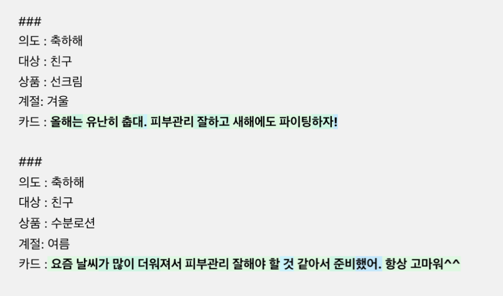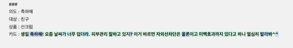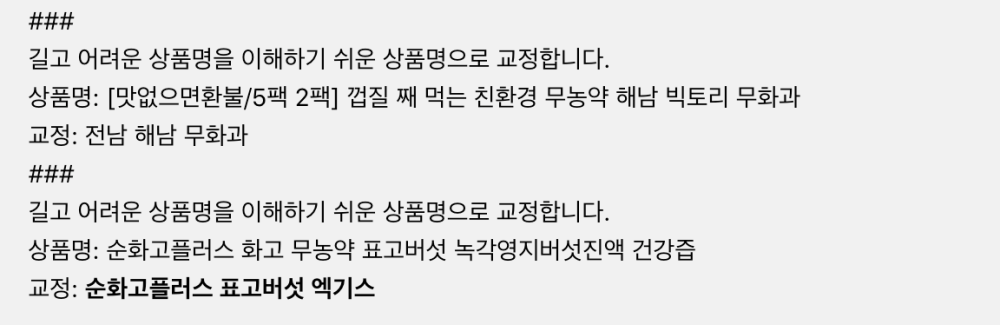 @장선우님, 1. 아래와 같이 이용을 부탁드립니다. v1/completions/{model} 2. 저희도 내부적으로 다양한 테스트를 해보았을때, 적절한 라벨링을 추가하는 것이 성능이 좋았습니다. 따라서 '제품:' 처럼 라벨링을 추가하는 것을 권장드립니다. 감사합니다.