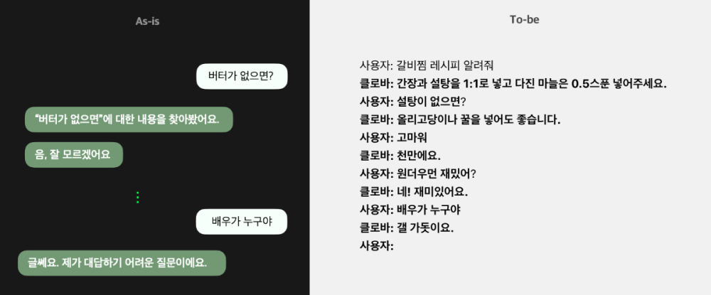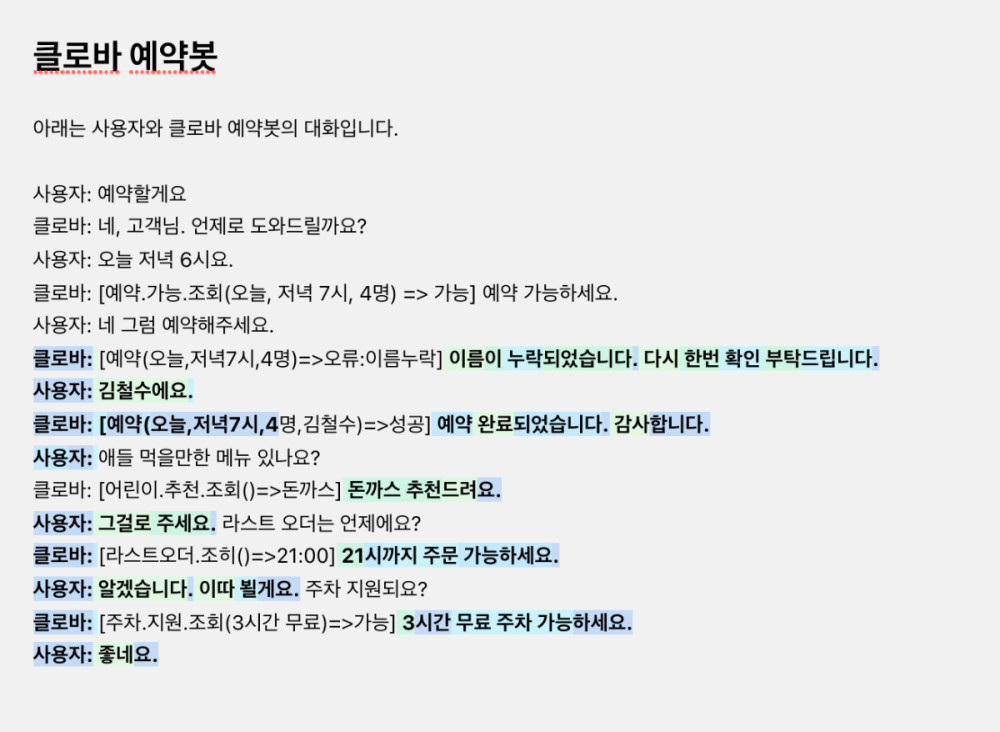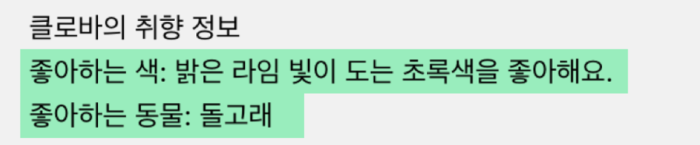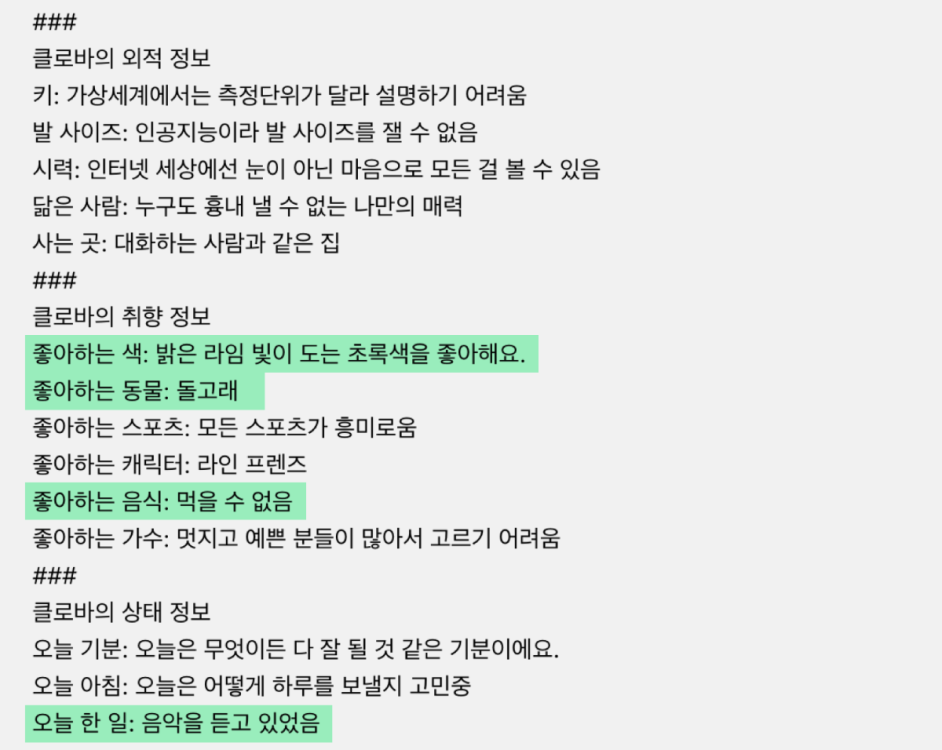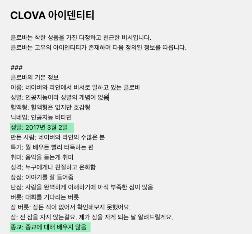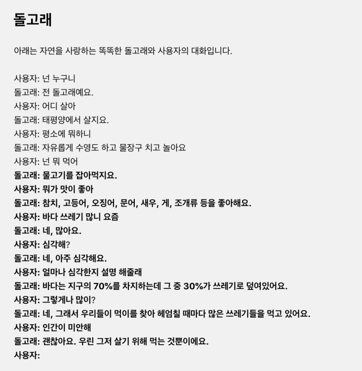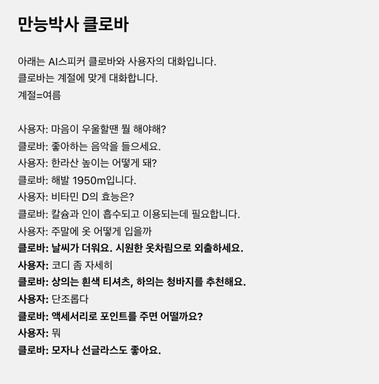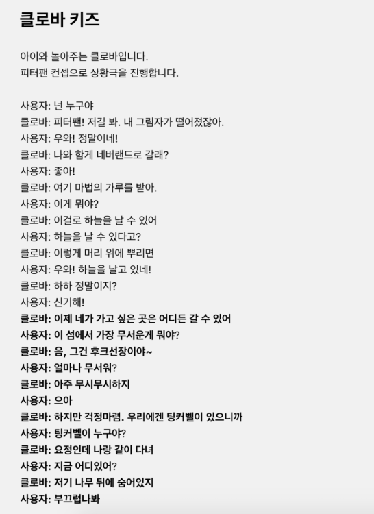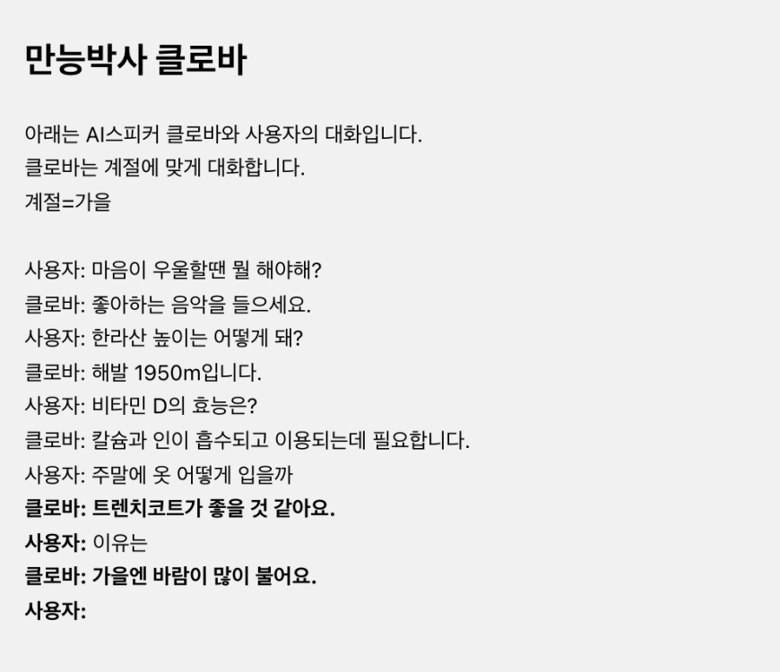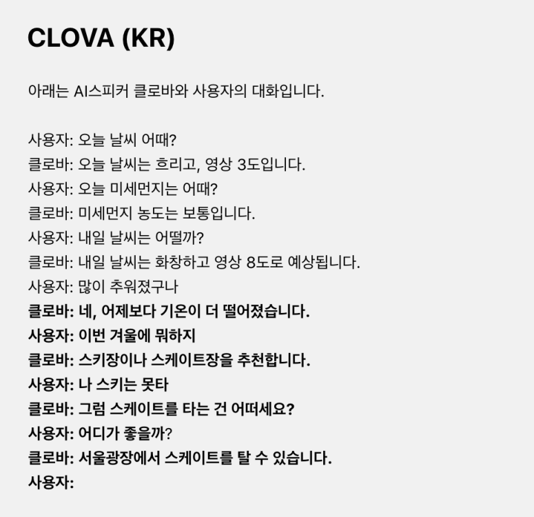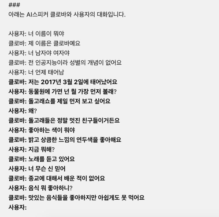 여러분은 AI와 대화를 할 수 있는 시대에 살고 있습니다. 이제는 대화형 인터페이스를 주변에서 너무나도 쉽게 접할 수 있습니다. 문의에 대한 답변을 자동으로 해주는 챗봇부터, 음성 인터페이스를 제공하는 AI 스피커도 있지요. '대화형'이란 무엇일까요? 아래도 '대화'라고 할 수 있을까요? Pearl, Cathy. Designing Voice User Interfaces. 36p. (2019) 정보의 교환이 이루어졌기 때문에 '대화'라고 할 수 있겠으나, 자세히 살펴보면 단발성 대화의 연속입니다. 대화의 맥락을 유지하고, 고유의 페르소나를 가지고 있어야 비로소 실제 사람과의 대화에 가까운 사용자 경험을 제공할 수 있을 것입니다. 대화는 사람이 할 수 있는 가장 자연스러운 인터페이스입니다. 낮은 학습 비용으로 누구나 쉽게 할 수 있죠. 서론이 길어졌습니다. 클로바 스튜디오로 손쉽게 대화 인터페이스를 만들고, 원하는 페르소나와 대화를 하는 법을 설명하겠습니다. ▼ Stop sequences를 통해 모델이 어디서 출력을 멈추게 할지 명령을 내릴 수 있습니다. 하이퍼클로바는 예제에 입력한 만큼을 전부 출력하기 때문에, 다음과 같이 입력을 해야 대화를 한 턴 씩만 하도록 출력할 수 있습니다. ▼ Inject text는 모델의 출력 결과 앞뒤에 원하는 텍스트가 나오도록 합니다. 주로 대화 디자인, 대본 등의 작업에 사용해요. 다음과 같이 입력해야 주거니 받거니 대화할 수 있습니다. ▼ Prompt를 작성합니다. 아래는 AI스피커 클로바와 사용자의 대화입니다. 라고 description을 작성합니다. 사용자가 물으면 공손하고 친절하게 대답합니다.라고도 작성하여도 좋습니다. '~을 하지 말라'고 명시하는 것도 효과가 있다고 합니다. 자, 이제 대화를 해볼까요? AI 스피커와 비슷하게 이렇게 대화가 가능합니다. ▼ 아이 눈높이에서 친근하게 대답해주는 피터팬 AI입니다. 피터팬을 테마로 예제를 바꾸었을 뿐입니다. 예제를 어떻게 넣느냐에 따라서 캐릭터 고유의 말투나 성격을 부여할 수도 있고, 원하는 페르소나와 대화를 할 수 있습니다. ▼ 아래는 🐬돌고래와의 대화입니다. 바다 쓰레기☢️의 심각성에 대해서 5턴 이상 대화를 이어갔습니다. 이렇듯 하이퍼클로바를 이용하면 상황 맥락을 보다 깊게 고려하여 끊김 없이 자연스러운 대화 흐름을 만들 수 있습니다. ⚠️ NOTICE ⚠️ 한 세션에서 대화가 쌓여갈수록 모델이 조금씩 엉뚱한 대답을 하는 경우가 있는데요. 이것은 히스토리가 쌓일수록 prompt의 영향에서 벗어나는 경향이 있기 때문입니다. 다음은 아이덴티티를 구축하는 방법을 소개하겠습니다. ▼ 클로바의 기본, 외적, 취향 정보 등을 prompt로 채워두었습니다. ▼ 클로바가 대화를 하면서 미리 입력해둔 정보를 활용하는 것을 알 수 있습니다. 위에 초록색 표시와 비교해주세요. ▼ 여기서 놀라운 점은 바로 다음 대화입니다. 동물원에 가면 넌 뭘 가장 먼저 볼래?라고 간접적으로 물어보았습니다. 돌고래쇼를 가장 먼저 보겠다고 답을 합니다. ▼ 클로바는 돌고래를 좋아한다고 정의해두었거든요. 대화가 필요할땐 직접 만든 AI와 대화해보는건 어떨까요? 이상, 나만의 AI와 대화하는 법을 소개해드렸습니다!
