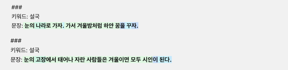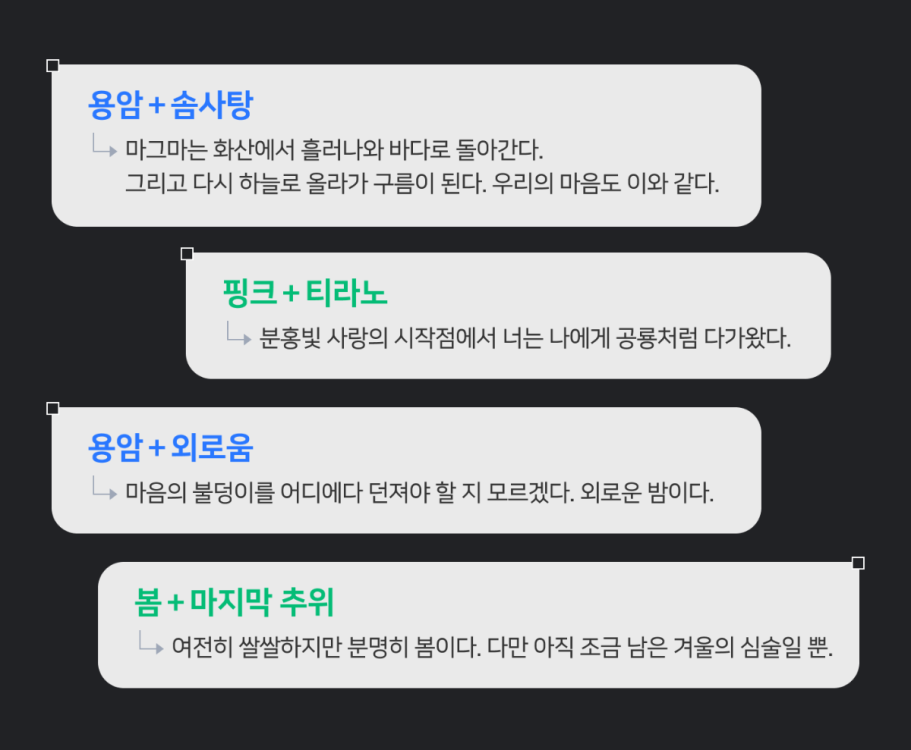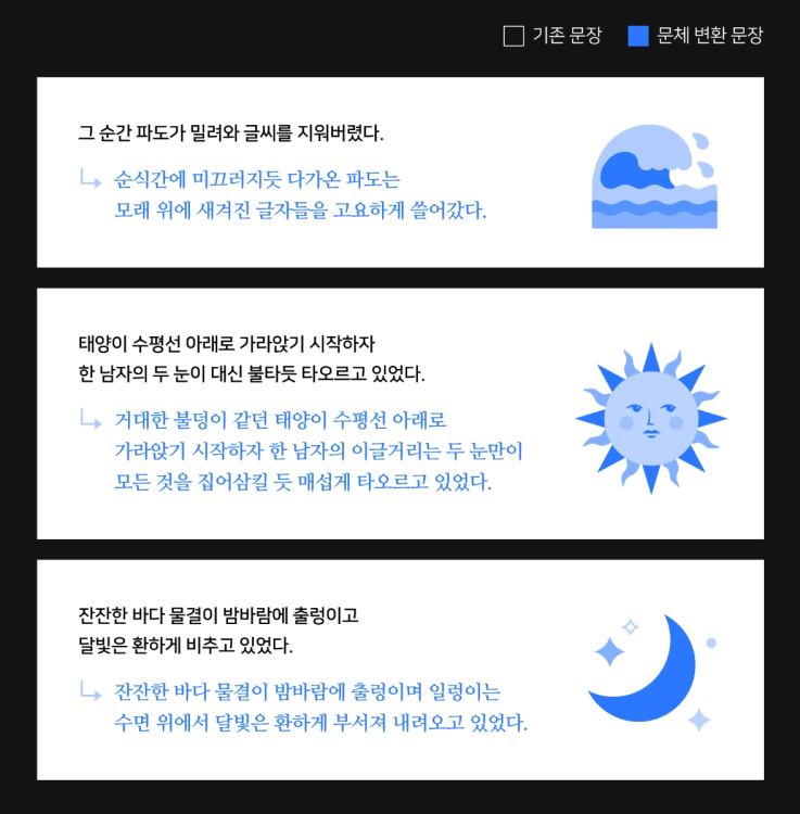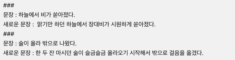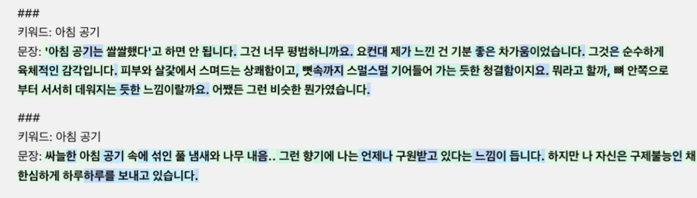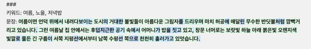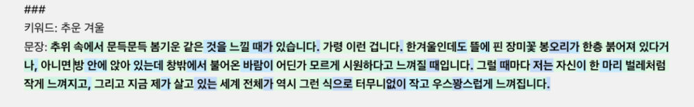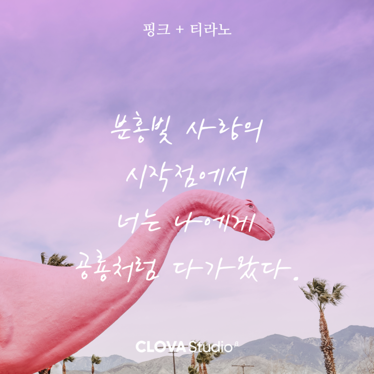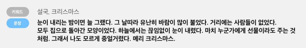 이 문장은 클로바 스튜디오로 만들어졌습니다. "겨울의 눈과 여름의 얼음으로 만든 음식들로 가득한 세상에서 살고싶다." '눈'과 '얼음'이라는 차가운 형(形)과 '겨울'과 '여름'이라는 대립적 관계의 두 이미지를 가지고 시상을 전개했습니다. 일 년 내내 '차가운 세상'이라는 배경이 더욱 강조되는 효과가 있네요. 여기에 '음식들로'라는 예측하지 못했던 수식어가 붙으니, 느낌이 달라지며 재미있는 상상을 불러일으킵니다. 마치 동화 속의 한 장면 같죠? "밤바다의 파도 소리와 별빛과 달빛만이 존재하는 곳에서 조용히 흘러가는 돛단배는 마치 은하수처럼 보였다." 위 문장은 '은하수', '돛단배', '바람'이라는 세 가지 단어를 인풋으로 넣어서 생성된 것입니다. 여러 감각이 함축된 문장 같은데요. '별빛과 달빛만이 존재...'라는 심상을 통해 '밤바다'의 고요함이 부각 되었습니다. 재미있는 사실은 하이퍼클로바 언어모델은 제가 인풋으로 넣은 '은하수'를 밤하늘의 별로 표현하지 않았어요. 돛단배가 만들어내는 잔잔한 물결이 별빛✨, 달빛🌙에 반사되고, 이게 마치 은하수🌌와 같음을 표현한 것이죠. 이전 글에서 제가 문체에 대해 설명을 한 적이 있습니다. (Text Generation, 어디까지 해봤니?) 오늘은 하이퍼클로바 언어모델의 다양한 시적 표현, 감성적인 글쓰기 등의 가능성을 살펴보겠습니다. 가벼운 글이니, 편하게 봐주세요. ▼ '카피책-당신이 쓰는 모든 글이 카피다'라는 책에서 카피라이터 정철은 어울릴거 같지 않은 두 단어를 조합해보라고 설명했습니다. 낯설게, 그리고 불편하게 조합을 해보면 주목도가 높은 재미있는 문장이 만들어질 수 있다는 거죠. 우리가 잘 아는 '8월의 크리스마스', '살인의 추억' 와 같은 영화도 낯선 단어의 조합으로 만든 제목이죠. 낯선 두 단어를 떠오르기가 쉽지가 않더군요. 그래서 제 아이의 도움을 받았습니다. 아이가 단어를 말하면, 제가 그 단어를 입력해서 문장을 만들어보는 거죠. ▼ '용암'과 '솜사탕'이라니! 어른의 상식으로는 쉽게 생각하기 어려운 조합이었습니다. "마그마는 화산에서 흘러나와 바다로 들어간다. 그리고 다시 하늘로 올라가 구름이 된다. 우리의 마음도 이와 같다." 이 문장에 '솜사탕'이라는 단어는 없지만, 바다로 흘러 들어간 마그마가 만들어낸 수증기를 '솜사탕'으로 표현한 것이 아닐까요? ▼ 아이는 한술 더 떠, '핑크', '티라노' 라고 운을 띄웠습니다. 작업을 캡처하지 못하여 이미지로 대신합니다. "분홍빛 사랑의 시작점에서 너는 나에게 공룡처럼 다가왔다." 놀랍지 않나요? 저는 생각도 하지 못했던 두 단어였는데, 두 단어의 조합으로 제 취향의 문장이 만들어져서놀라웠습니다. 어떤 인물이 내게 마치 '공룡'처럼 임팩트를 주었고, 그게 바로 '분홍빛 사랑의 시작점'이었다는 장면이 그려집니다. 엉뚱하지만 사랑스러운 이미지가 마치 미셸 공드리 영화의 한 장면 같죠. ▼ 다른 몇 가지 결과들입니다. 두 단어로 문장을 만들어 내었고, 이 놀라운 표현들은 어느 문학에 쓰여도 손색이 없다고 생각합니다. 클로바 스튜디오가 만들어내는 문장이 단조롭다고 느낀 적이 있으신가요? 낯선 단어들을 가지고 키워드로 조합해보세요. 따분하고 시시한 듯 보이는 우리 주변도 실로 수많은 매력적인 원석들이 가득하답니다. 작업을 하다 보면 '표절'과 같은 문제가 발생하는 경우가 있을 수도 있습니다. ▼ 다음은 '설국'이라는 키워드를 넣었는데, 소설 '설국'의 도입부가 그대로 나온 경우입니다. 추정하건대, '설국'의 해당 도입부가 블로그 등에서 자주 언급된 문장이기도 하고, '설국'이라는 단어 자체가 해당 소설로 이어지는 그런 또렷한 특징을 가져서 그런 게 아닐까 싶습니다. ▼ 이 경우 Temperature를 0.7 정도로 높이면, 토큰의 무작위성이 높아져 표절의 확률을 줄일 수 있습니다. ▼ 또는 처음 알려드린 거처럼, 두 단어의 조합을 하면 의외성이 더해져 새로운 창작을 할 가능성이 커질 것입니다. 저희는 이처럼 표절과 같은 문제에 대해서 인지하고 있으며, 이를 방지하기 위한 여러 가지 기능적인 방안을 고민하고 있답니다. 내용이 길어져 이만 마무리하고 2탄으로 다시 찾아오겠습니다. 갑자기 날씨가 많이 추워졌네요. 곧 봄이 오려나 봅니다. 모두 건강 유의하세요!