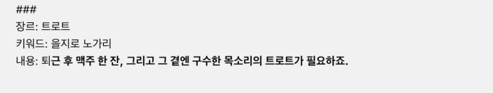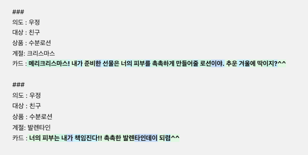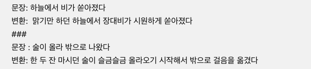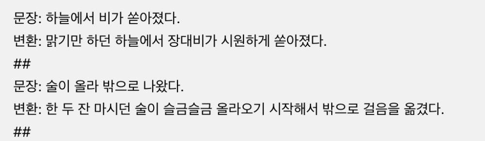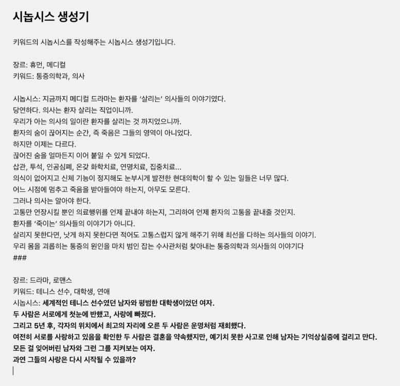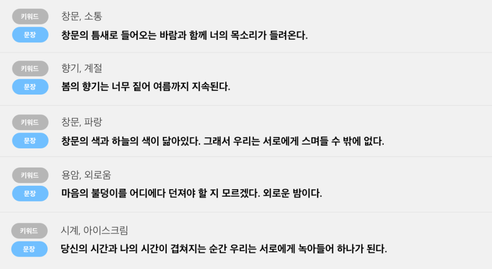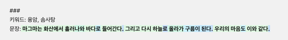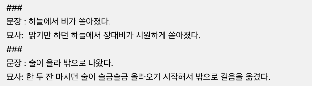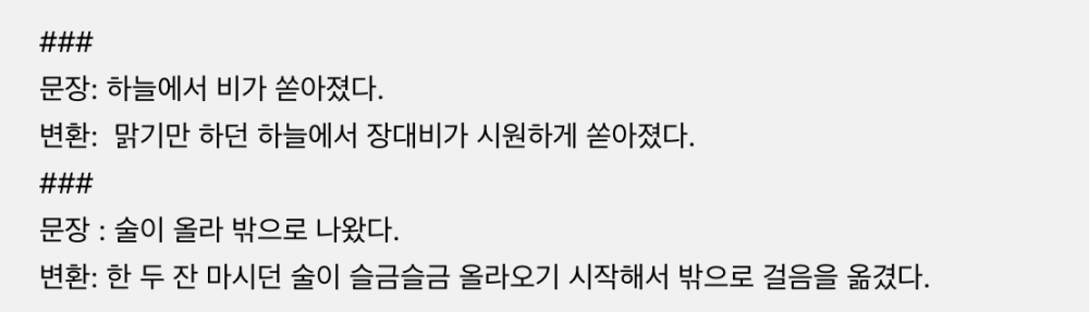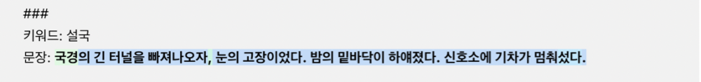 이 문장은 클로바 스튜디오로 만들어졌습니다. "겨울의 눈과 여름의 얼음으로 만든 음식들로 가득한 세상에서 살고싶다." '눈'과 '얼음'이라는 차가운 형(形)과 '겨울'과 '여름'이라는 대립적 관계의 두 이미지를 가지고 시상을 전개했습니다. 일 년 내내 '차가운 세상'이라는 배경이 더욱 강조되는 효과가 있네요. 여기에 '음식들로'라는 예측하지 못했던 수식어가 붙으니, 느낌이 달라지며 재미있는 상상을 불러일으킵니다. 마치 동화 속의 한 장면 같죠? "밤바다의 파도 소리와 별빛과 달빛만이 존재하는 곳에서 조용히 흘러가는 돛단배는 마치 은하수처럼 보였다." 위 문장은 '은하수', '돛단배', '바람'이라는 세 가지 단어를 인풋으로 넣어서 생성된 것입니다. 여러 감각이 함축된 문장 같은데요. '별빛과 달빛만이 존재...'라는 심상을 통해 '밤바다'의 고요함이 부각 되었습니다. 재미있는 사실은 하이퍼클로바 언어모델은 제가 인풋으로 넣은 '은하수'를 밤하늘의 별로 표현하지 않았어요. 돛단배가 만들어내는 잔잔한 물결이 별빛✨, 달빛🌙에 반사되고, 이게 마치 은하수🌌와 같음을 표현한 것이죠. 이전 글에서 제가 문체에 대해 설명을 한 적이 있습니다. (Text Generation, 어디까지 해봤니?) 오늘은 하이퍼클로바 언어모델의 다양한 시적 표현, 감성적인 글쓰기 등의 가능성을 살펴보겠습니다. 가벼운 글이니, 편하게 봐주세요. ▼ '카피책-당신이 쓰는 모든 글이 카피다'라는 책에서 카피라이터 정철은 어울릴거 같지 않은 두 단어를 조합해보라고 설명했습니다. 낯설게, 그리고 불편하게 조합을 해보면 주목도가 높은 재미있는 문장이 만들어질 수 있다는 거죠. 우리가 잘 아는 '8월의 크리스마스', '살인의 추억' 와 같은 영화도 낯선 단어의 조합으로 만든 제목이죠. 낯선 두 단어를 떠오르기가 쉽지가 않더군요. 그래서 제 아이의 도움을 받았습니다. 아이가 단어를 말하면, 제가 그 단어를 입력해서 문장을 만들어보는 거죠. ▼ '용암'과 '솜사탕'이라니! 어른의 상식으로는 쉽게 생각하기 어려운 조합이었습니다. "마그마는 화산에서 흘러나와 바다로 들어간다. 그리고 다시 하늘로 올라가 구름이 된다. 우리의 마음도 이와 같다." 이 문장에 '솜사탕'이라는 단어는 없지만, 바다로 흘러 들어간 마그마가 만들어낸 수증기를 '솜사탕'으로 표현한 것이 아닐까요? ▼ 아이는 한술 더 떠, '핑크', '티라노' 라고 운을 띄웠습니다. 작업을 캡처하지 못하여 이미지로 대신합니다. "분홍빛 사랑의 시작점에서 너는 나에게 공룡처럼 다가왔다." 놀랍지 않나요? 저는 생각도 하지 못했던 두 단어였는데, 두 단어의 조합으로 제 취향의 문장이 만들어져서놀라웠습니다. 어떤 인물이 내게 마치 '공룡'처럼 임팩트를 주었고, 그게 바로 '분홍빛 사랑의 시작점'이었다는 장면이 그려집니다. 엉뚱하지만 사랑스러운 이미지가 마치 미셸 공드리 영화의 한 장면 같죠. ▼ 다른 몇 가지 결과들입니다. 두 단어로 문장을 만들어 내었고, 이 놀라운 표현들은 어느 문학에 쓰여도 손색이 없다고 생각합니다. 클로바 스튜디오가 만들어내는 문장이 단조롭다고 느낀 적이 있으신가요? 낯선 단어들을 가지고 키워드로 조합해보세요. 따분하고 시시한 듯 보이는 우리 주변도 실로 수많은 매력적인 원석들이 가득하답니다. 작업을 하다 보면 '표절'과 같은 문제가 발생하는 경우가 있을 수도 있습니다. ▼ 다음은 '설국'이라는 키워드를 넣었는데, 소설 '설국'의 도입부가 그대로 나온 경우입니다. 추정하건대, '설국'의 해당 도입부가 블로그 등에서 자주 언급된 문장이기도 하고, '설국'이라는 단어 자체가 해당 소설로 이어지는 그런 또렷한 특징을 가져서 그런 게 아닐까 싶습니다. ▼ 이 경우 Temperature를 0.7 정도로 높이면, 토큰의 무작위성이 높아져 표절의 확률을 줄일 수 있습니다. ▼ 또는 처음 알려드린 거처럼, 두 단어의 조합을 하면 의외성이 더해져 새로운 창작을 할 가능성이 커질 것입니다. 저희는 이처럼 표절과 같은 문제에 대해서 인지하고 있으며, 이를 방지하기 위한 여러 가지 기능적인 방안을 고민하고 있답니다. 내용이 길어져 이만 마무리하고 2탄으로 다시 찾아오겠습니다. 갑자기 날씨가 많이 추워졌네요. 곧 봄이 오려나 봅니다. 모두 건강 유의하세요!