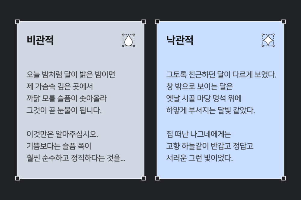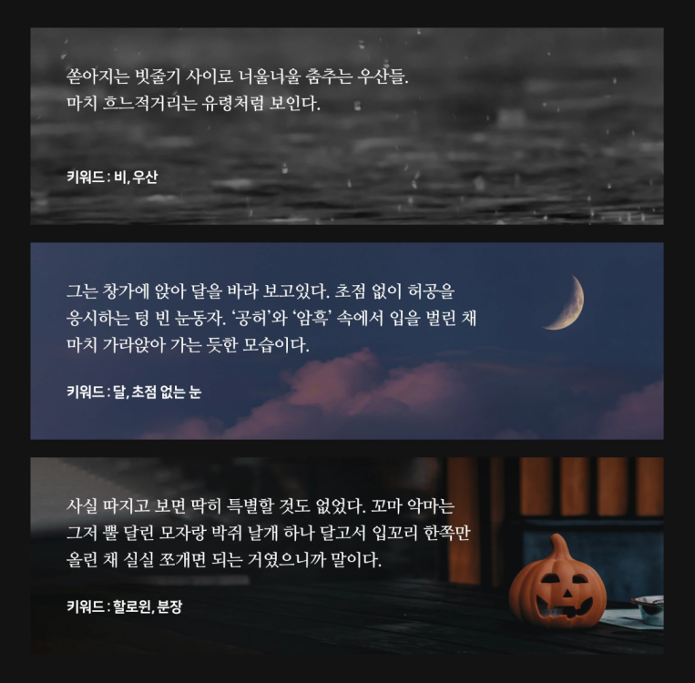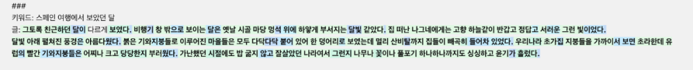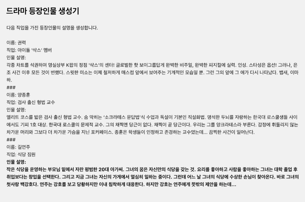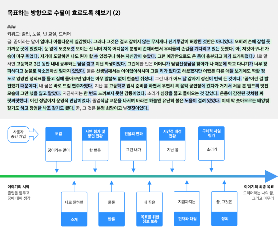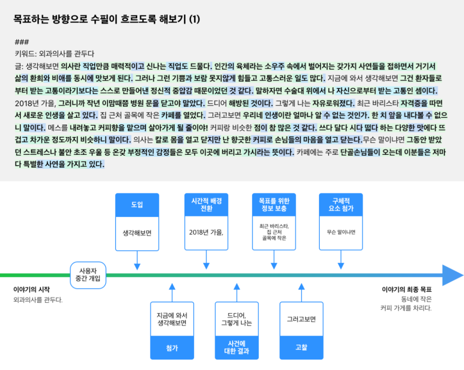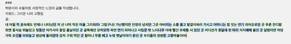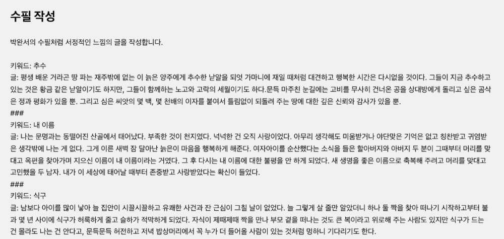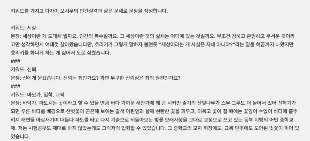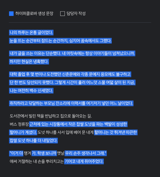 안녕하세요. CLOVA Studio 입니다. 😁 초거대 AI에게 많은 이들이 기대하는 것 중 하나는 아마도 시나리오, 소설과 같은 콘텐츠 창작일 것입니다. 일반적으로 시나리오는 일관된 성격을 갖춘 여러 인물이 등장하며, 여러 사건을 전개해 나가면서 긴 서사를 만들어 냅니다. 하지만 저희가 내부적으로 검토해 보았을 때, '아직은' 하이퍼클로바 언어모델이 기승전결에 대한 개념이 없어서 펼쳐진 이야기를 끝맺지 못하고, 개연성을 구성하기 위한 복합적인 논리력도 다소 부족해 보였습니다. 이러한 미흡한 점이 있기에 시나리오 창작은 현재 저희가 비중을 두어 진행하고 있는 상황은 아니지만, Hyperscale AI를 통한 창작 작업은 앞으로 우리가 풀어가야 할 중요한 숙제입니다. 반면에 수필은 그나마 소설처럼 형식에 구애받지 않고 자유롭게 쓸 수 있어서, 클로바 스튜디오로 활용해 볼 만하겠다고 생각했습니다. 일상생활 속 겪은 일, 과거의 경험 등 내가 보고 느낀 것을 쓰면 되는 것이죠. 하지만 누군가에게는 이마저도 어려운 작업일 수 있습니다. 만약에 클로바 스튜디오가 보조 도구로써 옆에서 수필을 도와준다면 어떨까요? 그럼 지금부터 제가 클로바 스튜디오를 활용하여 수필을 만들어내는 과정을 보여드리겠습니다. 먼저 저는 Maximum tokens을 50으로 설정했습니다. 언어모델에게 너무 많은 것을 맡기지 않은 것이죠. 출력 결과를 한두 문장 단위로 쪼개고, 중간중간 제가 개입해서 '이어주는 말'을 첨가합니다. 이를 통해 출력 결과가 산으로 가지 않도록 했습니다. ▼ 예를 들어 이런 것입니다. '가까이'라는 단어를 넣어서 인물을 피사체 앞으로🕴 옮기기도 하고, '어쩌면'이라는 단어를 넣어서 인물의 사유🤔를 담아냅니다. '한번은'을 넣어서 인물의 과거를 회상합니다. 하이퍼클로바 언어모델은 세부적인 묘사를 하고 확장해 나가는 것에는 뛰어나기 때문에, 이 작은 조각들을 조립해 나가면 좋은 글이 완성이 될 거 같았습니다. ▼ 아래 작업은 '①의사를 관두게 된 내용'에서 시작해서, '②동네에 작은 까페를 차리게 된 내용'까지를 목표로 하고 있습니다. 도입부는 사색이 필요할 듯하여 '생각해보면'으로 운을 띄웠습니다. 하이퍼클로바 언어모델은 이어서 써 내려가기 시작합니다. '...인간의 육체라는 소우주 속에서 벌어지는 갖가지 사연들을 접하면서 거기서 삶의 환희와 비애를 동시에 맛보게 된다.' 라는 문장이 눈에 띕니다. 괜찮은 방향으로 글이 써 내려가질 수 있을 거 같은 느낌이 듭니다. ▲ 의사를 관두게 된 어느 시점으로 전환이 필요할 거 같아서 '2018년 가을'이라고 입력했습니다. 그 시점에 병원을 닫았고 비로소 자유로워졌다고 설명했습니다. 목표하는 이야기로 흐를 수 있도록 '최근 바리스타', '집 근처 골목에 작은'이라고 적어서 정보를 보충합니다. 그다음 '그러고보면'을 넣어서 다시 한번 어떤 사유를 담아냅니다. 커피와 의사라는 전혀 상반된 주제에 대한 작가의 생각을 담아내기 위해 '커피랑 비슷한', '의사는'이라는 양념을 첨가하여 원하는 문장을 유도해 내었습니다. 저는 드라마 '심야식당'과 같이 특별한 공간이길 바랐습니다. 그래서 마지막으로 '카페에는 주로'라고 넣어, 여러 단골이 모이는 공간으로 만들었습니다. 하나 더 해볼까요? ▼ 졸업하는 어느 학생이 노을을 보며 자신의 꿈에 대해 생각해보는 내용을 쓰고자 했습니다. 이번엔 '꿈이라는 말이'로 시작했습니다. '...그것은 결코 잡히지 않는 무지개나 신기루 같이 허망한 것만은 아니었다. 오히려 손에 잡힐 듯 가까운 곳에 있었다.' 어때요? 이 정도면 훌륭한 도입부가 아닐까요? ▲ '나로 말하면'을 넣어 인물에 대해 자세한 설명을 추가합니다. '3년 내내 공부와는 담을 쌓던 학생'이라는 결과가 출력되었습니다. 이에 대해 자세한 에피소드가 필요할 거 같아서 '한 번은'을 넣어서 사연을 첨가했습니다. 장면이 전환되는 것을 확인할 수 있습니다. 꿈에 대해서 논하는 내용이기 때문에, 인물의 어떤 심리적인 변화가 필요하겠죠. '그런 내가'를 넣어서 인물의 변화를 유도하였습니다. 이제 그 꿈이 무엇인지 명시를 해야 했습니다. '내 꿈은'이라고 적어서 '드러머'라는 꿈으로 흘러가도록 합니다. 그 꿈을 가지게 된 계기가 필요하겠죠. 이번엔 '지난 봄'을 넣어 장면을 전환합니다. 이야기 마무리를 위해 수미상관(ㅋ) 형식으로 '꿈, 그것은'이라고 도입부와 비슷하게 넣어서 끝맺음하였습니다. '감성적인 글'이라는 말이 자칫 진부하게 들릴 수도 있습니다. '감성'이 뭘까요? '감성'은 감정, 정서라고 불리는 것들을 말하죠. 이러한 마음의 성질은 수필에서 다양한 톤으로 나타나기도 합니다. ▼ 박완서 소설가는 따듯하고 온기를 가진 시선으로 이야기를 쓰시죠. '노란집'이라는 산문집을 참고하여 프롬프트로 넣었습니다. ▼ 다음은 '그리운 나의 고향집'이라는 키워드를 가지고 비슷한 정서로 글을 생성한 결과입니다. ▼ '스페인 여행에서 보았던 달'을 인풋으로 넣고 생성한 결과입니다. 마찬가지로 비슷한 정서가 느껴집니다. ▼ 이번엔 다자이 오사무의 '인간실격'에 나오는 문단들을 프롬프트로 넣었습니다. 인간의 고통스러