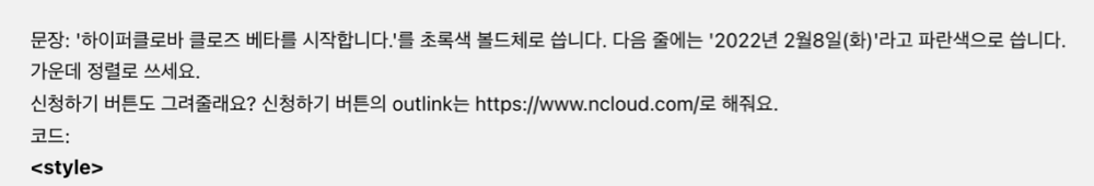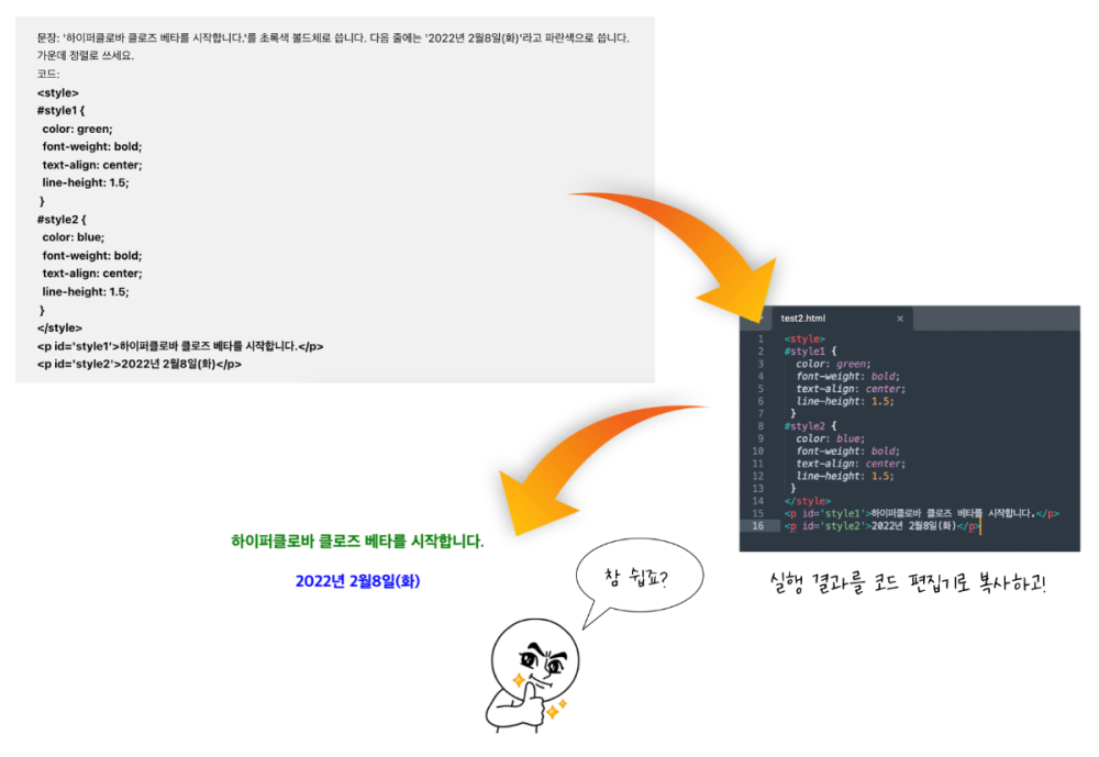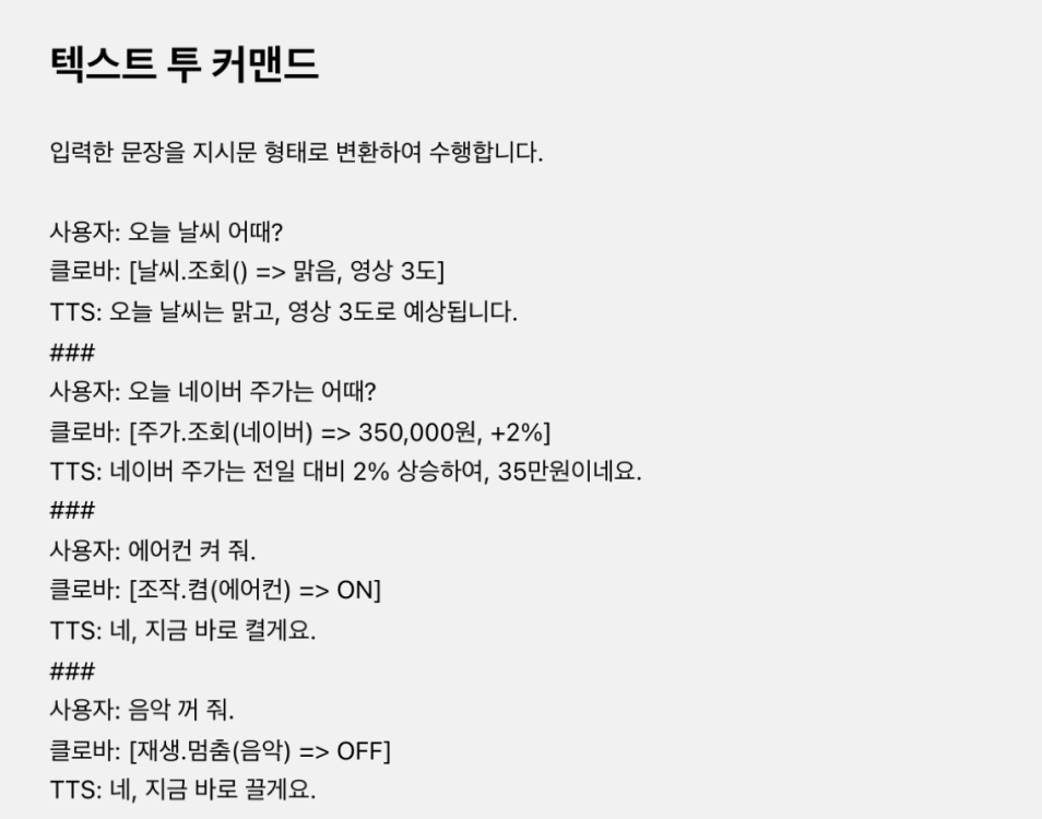 01000011 01001100 01001111 01010110 01000001 00100000 01010011 01110100 01110101 01100100 01101001 01101111 뭐죠? 암호문인가요? 이 복잡한 숫자는 바로 0과 1을 사용하는 컴퓨터의 언어입니다. 위 이진수를 인간의 언어로 변환하면 'CLOVA Studio'가 된답니다! 그러면 사람과 컴퓨터는 어떻게 의사소통할까요? 컴퓨터는 사람이 사용하는 말을 바로 알아들을 수 없어서, 컴퓨터가 알아들을 수 있는 말로 변환이 필요하죠. 이때 사람의 언어와 컴퓨터의 언어를 이어주는 것이 바로 프로그래밍 언어입니다. 프로그래밍 언어는 컴퓨터에 가까울수록 저수준 언어, 인간과 가까울수록 고수준 언어라고 합니다. 흔히 우리가 '컴파일링'이라고 하는 건 고수준 언어를 저수준 언어로 변환하는 과정을 말해요. 지금부터 클로바 스튜디오를 통해 사용자 발화의 의도를 이해하고, 지시문 형태로 변환하여 대신 수행 해주는 작업을 보여 드리겠습니다. ▼ 먼저 자연어 문장과 intent를 예제로 넣었습니다. ▼ "TV 볼륨 10으로 해줘."라는 문장을 [음량.높임(TV) => 10]으로 시스템이 이해할 수 있는 형태로 변환하였네요. ▼ "블라인드 닫아줘."라는 문장은 [조작.닫힘(블라인드) => CLOSE]으로 변환했습니다. ▼ 이렇게 지시문만 입력한 경우에도 자연어로 변환을 했습니다. 어때요? 그럼 이렇게 활용할 수도 있지 않을까요? ▼ 예약 시스템의 포맷 데이터를 가지고, 대화형으로 변환할 수 있습니다. [...] 입력은 제가 한 것이고, 컬러 표시된 것이 클로바의 결과입니다. 뿐만 아니라 자연어 질의를 검색엔진에 유리한 형태로 가공하여 정답을 출력할 수도 있습니다. ▼ "미금역 근처에 있는 스테이크 집 아웃백 위치가 궁금해 왜냐하면 내 아들이 거기 가고 싶다고 했거든 빵이 맛있어"라는 아주 긴 이 문장에서도 '미금역 근처에 있는 스테이크 집 아웃백 위치'라는 사용자 의도를 파악하고, 최종적으로 [검색("미금역 근처 맛집") = '아웃백스테이크하우스 분당미금점']라는 지시문으로 변환했습니다. 응답 결과는 대화형으로 변환할 수도 있죠. ▼ "나 궁금한게 있는데 피가 왜 빨간색인지 그것이 너무 궁금한거야. 왜냐하면 내가 내가 색종이 자르다가 피가 났는데 왜 초록색이 아닐까" [검색('피 색깔') = 적혈구에 포함된 헤모글로빈의 색 때문에 붉은 색을 띠는것]라고 지시문과 결과를 출력했습니다. "피는 적혈구에 포함된 헤모글로빈의 색 때문에 붉은색을 띠는 것입니다."라고 대화형 결과도 제공합니다. 조금 더 까다로운 질의를 해보겠습니다. ▼ "그 머냐 그 거미인간 거미줄 쏘고 댕기는 그 머지 그 영화 찾아줘"라는 질문은 [검색('스파이더맨')=스파이더맨 홈커밍] 이라고 변환했습니다. 개떡같이 말해도 찰떡같이 알아듣는 하이퍼클로바 언어모델입니다. 자연어를 본격적인 프로그래밍 언어로 가공하는 작업을 만들어볼까요? 입력한 문장에서 스타일적인 요소를 파악하여, HTML 코드에 style 속성을 입히는 작업을 만들어보았습니다. ▼ "'하이퍼클로바 클로즈 베타를 시작합니다.'를 초록색 볼드체로 씁니다. 다음 줄에는 '2022년 2월8일(화)'라고 파란색으로 씁니다. 가운데 정렬로 쓰세요."라고 입력을 합니다. 참고로 프롬프트에는 하나의 예제만 넣은 상태입니다. ▲ style 태그를 적용한 html 코드로 전환된 것을 확인할 수 있습니다. 아, 이런! 결과가 출력된 상태에서 이런 요청이 생겼네요. ▼ '신청하기 버튼도 그려줄래요? 신청하기 버튼의 outlink는...'이라고 한 줄 추가하고 다시 실행합니다. ▼ 그러면 이렇게 버튼에 대한 코드가 추가로 생성됩니다. ▼ 이제 코드 편집기에서 실행해보면, '신청하기' 버튼이 만들어진 것을 확인할 수 있습니다. 물론 버튼을 클릭하면 요청한 페이지로 이동까지 합니다. 이번엔 자연어를 if문으로 가공하는 실험을 해보았습니다. ▼ 마일리지, 연령별 조건들을 적고, 조건이 아닌 경우에 대해서도 명시했습니다. 실행을 눌렀더니 간단한 if~else문으로 변환해주었네요. 이 작업의 경우, 프롬프트에 별도의 예제를 넣지 않았습니다. 지금까지 텍스트를 커맨드로 변환하는, 그리고 그 반대의 과정에 대해서도 살펴보았습니다. 최근 Deepmind가 AlphaCode(링크)를 공개하여 많은 화제가 되었죠. Github 등 여러 출처의 개발 코드들을 가지고 Pre-trained과 Fine-tuned된 모델을 통해, 아주 고수준의 프로그래밍 언어를 구사할 수 있습니다. 이제는 지시문을 기계 언어로 변환하는 것에서만 그치는 것이 아니라, 복잡한 문제를 해결하는 단계까지 다가간 거 같습니다. Text 2 Command로 시작한 글이었는데, 결론은 코딩하는 AI가 되었네요. 하이퍼클로바 언어모델은 앞으로 어떤 형태로 발전해 나갈 수 있을까요?