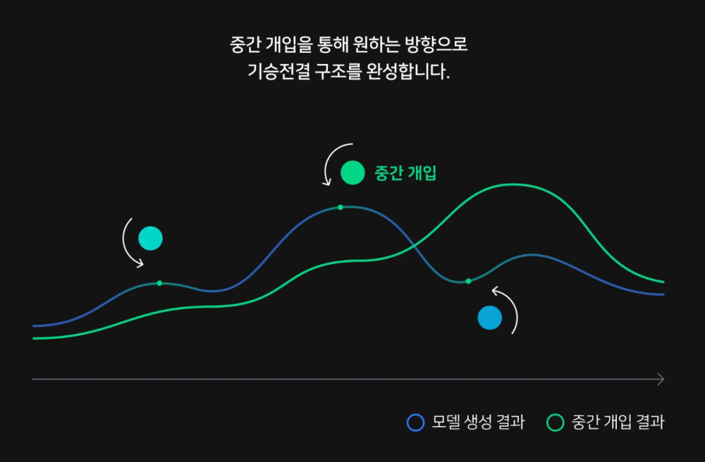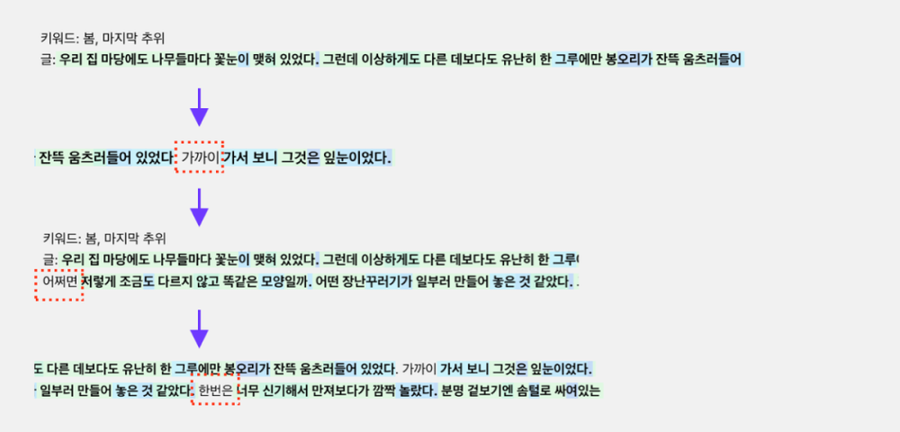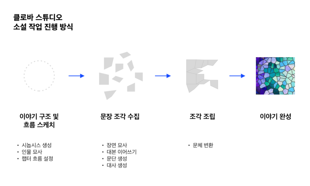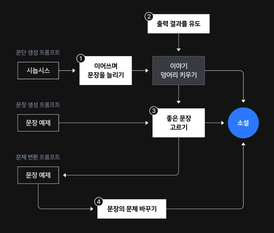 본 포스팅은 2022년 9월 29일 CLOVA Engineering Blog에 먼저 게재된 글입니다. (바로 가기) 지난 포스팅에서는 HyperCLOVA 언어 모델을 활용하여 소설을 창작했던 경험을 소개했습니다. 지난 포스트 보기 이번 글에서는 그 소설을 하이퍼클로바 언어 모델로 어떻게 완성했는지 구체적인 방법에 관해서 설명해 볼게요. 클로바 스튜디오, 사람의 협업 도구가 되다 글을 쓰다 보면 한 번쯤 모니터 속 깜빡이는 커서만 멍하니 바라보던 경험이 있을 겁니다. 이 포스팅을 쓰고 있는 저 역시 글이 잘 써지지 않아 애꿎은 마우스 휠만 빙빙 돌리던 날들이 많았죠. 그랬던 제가 지금은 10회차 이상의 소설을 연재한 아마추어 작가가 되었습니다. 어떻게 가능했을까요? 그건 바로 사람의 글쓰기를 도울 수 있는 도구, 클로바 스튜디오 덕분입니다. 늘리고, 유도하고, 고르고, 바꾸고 소설 쓰기는 아래 그림처럼 크게 네 가지 방법으로 진행되었습니다. 첫째, 입력한 시놉시스를 기반으로 이야기가 이어 써지며 확장될 수 있도록 합니다. 확장된 이야기는 다시 프롬프트에 쓰일 수 있습니다. 둘째, 모델이 올바른 방향으로 생성해나갈 수 있도록 중간중간 지시하면서 결과를 유도합니다. 셋째, 이 과정에서 전개에 도움이 되는 문장이나 표현력이 좋은 문장들은 따로 수집합니다. 수집된 문장은 이야기 전개에 도움이 되는 경우 선별되어 사용됩니다. 넷째, 단조로운 문장의 표현력을 바꾸어서 문장을 더 흥미롭게 만듭니다. 첫 번째, 이야기의 눈덩이를 만드는 일 우리가 눈사람을 만드는 과정을 한번 생각해 볼까요? 처음에는 작고 보잘것없는 눈덩이지만 계속 굴리다 보면 어느새 커다란 덩어리가 되어 있죠. 글쓰기는 이 ‘눈덩이'를 만드는 것에서부터 시작합니다. 아래는 로맨스 판타지 장르의 소설을 만들었던 과정입니다. 작은 화실은 운영하던 주인공 세나가 화실에서 잠이 들었다가 눈을 떠보니 1920년대 프랑스 니스였고, 이곳에서 화가로서 성공하고 사랑하는 연인도 만나게 되는 내용입니다. 먼저 클로바 스튜디오에서 플레이그라운드라는 작업 영역에 간략한 시놉시스와 대사를 포함한 도입부 서너 문장을 프롬프트(Prompt)로 입력한 후 실행 버튼을 누릅니다. ➊ 모델은 기존에 작성된 부분과의 연결성을 고려하여 자연스럽게 다음 문장을 만들어냅니다. ➋ 이렇게 만들어진 결과물은 다시 프롬프트의 재료로 쓰입니다. ➌ 이 과정을 반복해 나가면서 문장을 생성합니다. 이 방법을 통해 작가는 자신이 구상한 이야기의 작은 눈덩이에서부터 시작해서 점차 그 분량을 키워나갈 수 있죠. ※ 프롬프트(Prompt): 하이퍼클로바 언어 모델을 수행하기 위해 입력하는 지시문과 예제문의 형태 두 번째, 사람의 손 터치로 모델의 창작을 주무르다 그렇다면 모델이 스스로 이어 쓰며 만들어간 이야기는 과연 재미있을까요? 아무래도 모델은 이야기꾼은 아니었나 봅니다. 솔직히 말해 모델이 스스로 만들어낸 이야기는 크게 인상 깊지 않았습니다. 인과관계 없이 단순히 장면을 나열하는 경우나, 이야기의 방향이 기대와 다르게 전개되는 경우가 많았습니다. 그러다 보니 비슷하게 소설 흉내는 내었지만, 어딘가 어색하고 재미가 없었죠. 일반적으로 플롯은 소설 속에서 일어나는 여러 사건이 효과적이고 개연성 있게 짜인 것을 말하는데요. 모델의 결과는 그렇지 못했죠. 그건 아마도 현재 모델이 플롯이나 문학적 장치와 같은 데이터를 충분히 학습하지 않았기 때문일 것입니다. 아래 그림은 모델의 순수한 출력 결과이며 전개에 문제가 있는 실패 사례입니다. 뜬금없는 인물이 갑자기 문을 두드리며 등장하며, 심지어 이름은 현아로 주인공이 가르치던 학생의 이름과 같습니다. 두 인물은 이야기를 나누다가 현아는 갑자기 자신이 아프다고 고백합니다. 주인공 세나는 다음날 일자리를 구하기도 하고, 갑자기 고향 집에 내려가겠다는 다짐을 합니다. 이렇게 맥락 없는 흐름이 연속되다 보면 독자 입장에서는 이해하기 어렵고 몰입감도 떨어지게 될 것입니다. 그래서 필요한 것이 사람의 개입이었습니다. 저는 언어 모델의 생성 결과 중간중간에 개입해서 모델이 이야기 흐름에서 벗어나지 않도록 했습니다. 한 가지 재미있는 사실은 약간의 개입만으로도 모델이 제가 의도한 대로 이야기를 이끌어 간다는 것입니다. 예를 들어볼까요? 아래 그림은 중간에 개입했던 흔적들입니다. 주인공 세나가 화실 운영에 어려움을 겪고 있다는 배경에 대한 설명에서 벗어나고 싶었습니다. 그래서 ‘그러던 어느 보통날이었다.’를 입력한 뒤 실행 버튼을 눌러 시간을 전환 시켰습니다. 모델은 ‘나는 여느 때와 같이 그림을 그리고 있었다.’라는 결과를 출력하며 장면을 바꾸어 전개를 이어갔습니다. 앞서 보여드린 실패 사례에서 수입과 월세에 대해 고뇌하던 우울한 감정의 주인공과는 다른 전개임을 확인하실 수 있습니다. ‘내가 자주 그리던 그림은’를 입력해서 모델이 그림에 대해 자세히 설명하게 하였습니다. 그리고 이제 본격적으로 판타지적인 소설 전개가 가능하도록 상황을 조성하였습니다. ‘지금부터 하는 이야기는 황당할 수 있다’, ‘그러던 중’ 