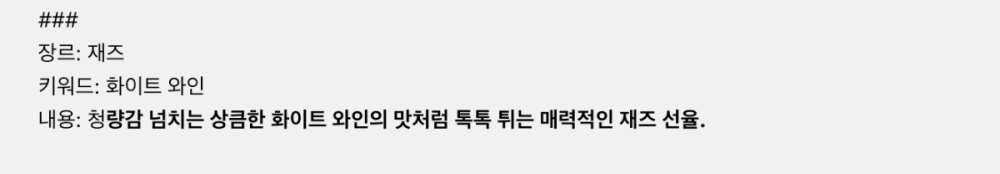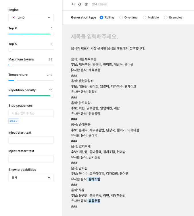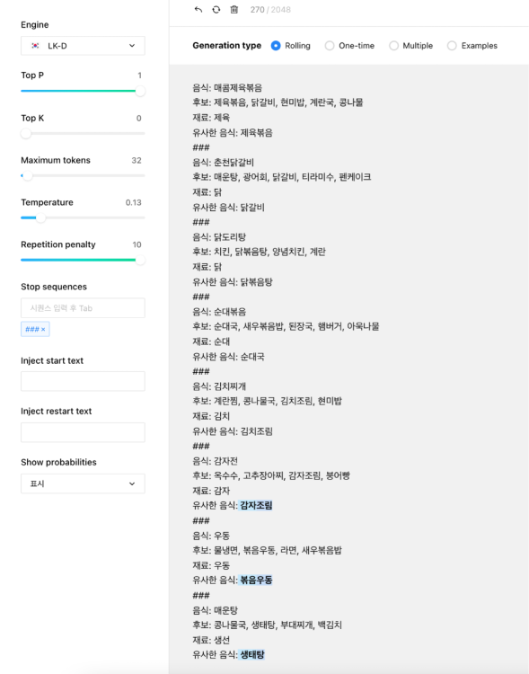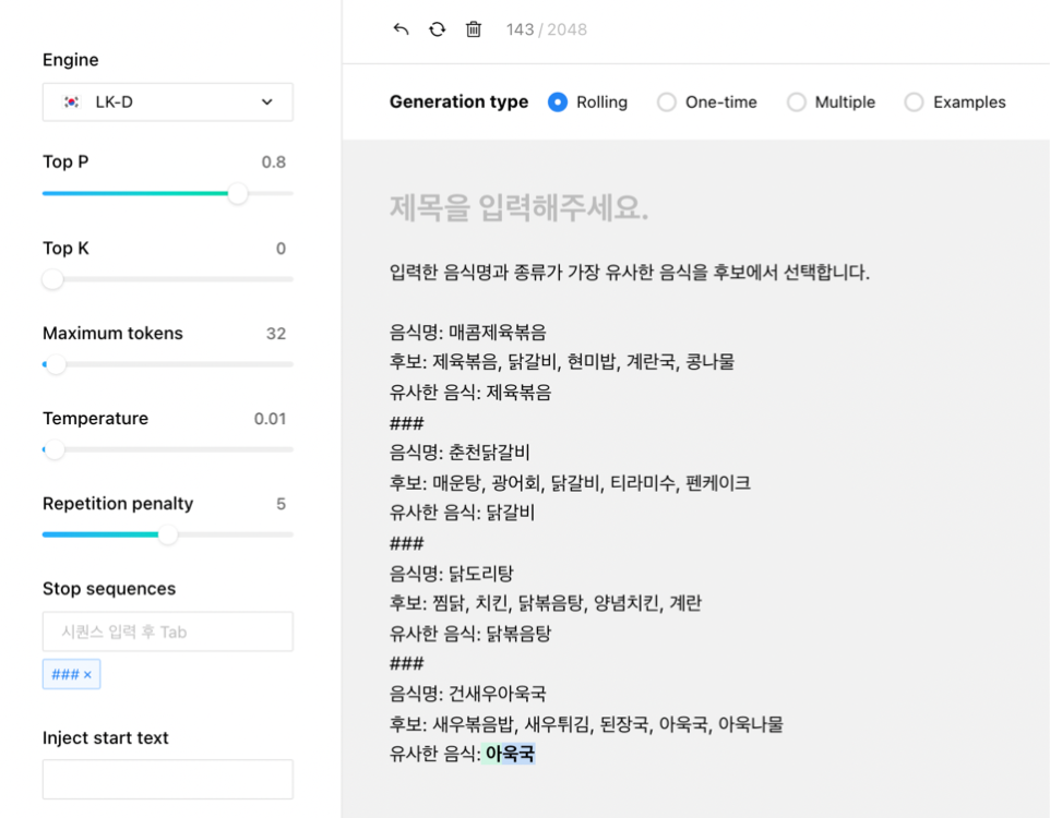 안녕하세요, 클로바 스튜디오 담당자입니다. @김지수님, 말씀주신 작업에 대해서 저도 클로바 스튜디오에서 시도해보았습니다. 1. 괄호 안에 후보군을 넣는 것 보다는, 다른 줄로 구분하는 것이 예제가 좀 더 명확한거 같습니다. ▼ 이 경우 성능이 더 좋았습니다. Temperature는 0~0.15 사이로 하였습니다. ▼ 재실행시 오답인 경우도 간혹 있었지만, 예제를 조금 더 추가하였더니, 아래와 같이 성공 수행하였습니다. Top P는 1, Temperature는 0.13, Repetition penalty는 10으로 설정하였습니다. ▼ '유사한 음식'이라는 정의가 좀 모호할 수도 있겠다는 생각이 들었습니다. ① 입력하신 예제를 보면 닭도리탕의 후보군 중에 '찜닭', '닭볶음탕'이 있었는데요. 국립국어원을 살펴보면 닭도리탕, 닭볶음탕은 동일한 음식, 또는 논란이 있는 어원으로 나옵니다. 매운맛을 기준으로 유사하다고 해야할까요? 또는 '닭'이라는 재료를 기준으로 유사하다고 해야할까요? ② 건새우아욱국의 후보군을 보면 '새우볶음', '새우튀김', '아욱국'...이 존재하는데 , 유사한 음식을 뽑기가 애매합니다. '새우'를 기준으로 보면 '새우볶음','새우튀김'이 선택되어야 할 것 같고, '아욱'을 기준으로 보면 '아욱국'이 선택되어야할 듯 합니다. 이를 아래와 같이 '재료'라는 필드를 두게 되면 성능이 좀 더 향상된 것을 정성적으로 확인하였습니다. 어떤 '재료'를 기준으로 뽑아달라고 모델에게 힌트를 주는 것이죠. 위 작업들은 프롬프트를 수정해가면서 기대결과에 가장 근접한 프롬프트를 탐색하는 과정입니다. 일정 수준까지의 기대수준에 도달하면, 성능을 더욱 높일 수 있는 구현 방안에 대한 논의도 이어갈 수 있을 듯 합니다. 2. "영어 엔진을 사용할때 제시문을 영어/한글 둘 중 어느것으로 줘도 상관이 없나요?"에 대해 답변드립니다. 영어 엔진 사용 시 한글 지시문을 넣으면, 성능이 많이 떨어질 수 있습니다. 감사합니다.