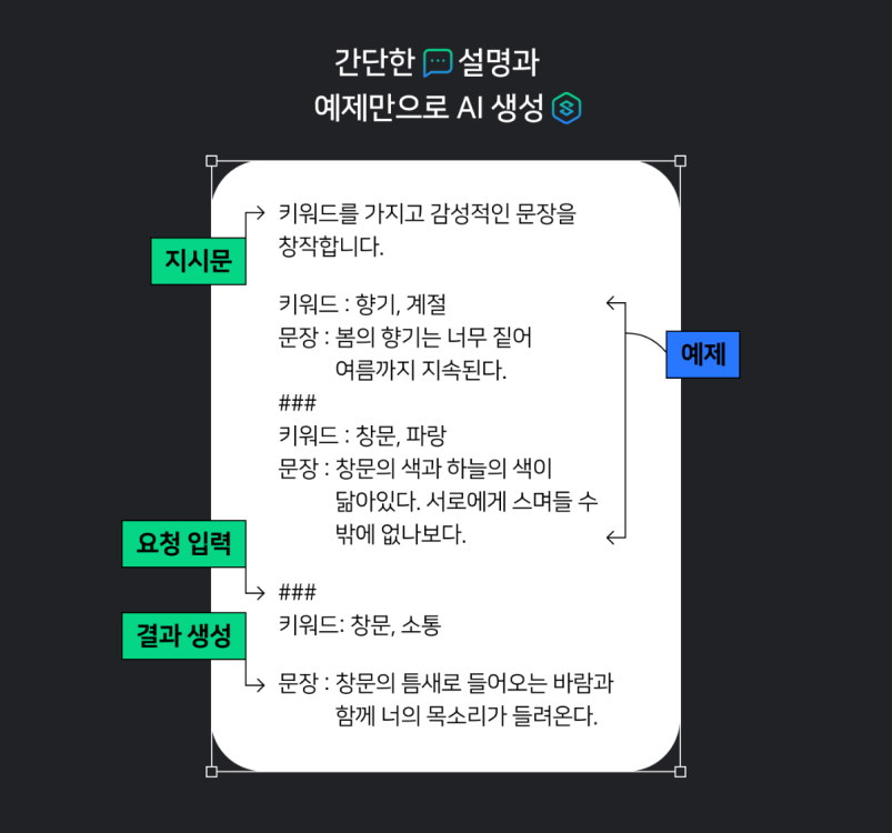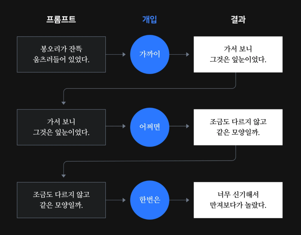 본 포스팅은 2022년 8월 5일 CLOVA Engineering Blog에 먼저 게재된 글입니다. (바로 가기) 하이퍼클로바에 감성 같은걸 끼얹나? 여기 어울릴 것 같지 않은 두 단어가 있습니다. 시계와 아이스크림이라는 단어를 가지고 감성적인 문장을 만들어본다면 우리에겐 어느 정도의 시간이 필요할까요? 아마 꽤 오랜 시간이 걸릴지도 모릅니다. 왜냐하면 이런 상황에서 어떤 감정을 느껴야 하는지 생각해본 적이 많이 없기 때문이죠. 그렇다면 하이퍼클로바 언어 모델은 이 두 단어를 조합해서 어떤 문장을 만들어낼 수 있을까요? 시계와 아이스크림이라는 이질적인 두 단어로 이렇게 멋진 문장을 만들어냈습니다. 시계는 시간이라는 추상적인 개념을 시각화한 물건이죠. 아이스크림은 녹는 성질이 있습니다. 그리고 사랑처럼 달콤하죠. 그리고 그 둘 사이에는 ‘겹친다’와 ‘녹아든다’라는 표현으로, 감정적이고 감각적인 느낌을 전달하고 있습니다. 사랑하는 사람과의 관계에서 느낄 수 있는 설렘과 달콤함을 표현한 문장입니다. 어쩌면 언어의 마술사 하이퍼클로바 언어 모델은 이렇게 생각지도 못했던 단어들의 조합을 가지고도 감성적인 문장을 만들어냅니다. 비유와 상징의 시적 표현을 사용하면서 말이죠. 이뿐만 아니라 문체를 변환하기도 하며 글의 전체적인 분위기도 다룰 수 있습니다. 이를테면 냉소적이면서 비관적인 시선의 글을 쓸 수도 있고, 따듯하고 온기를 가진 시선의 글을 쓸 수 있죠. 다음은 각각 하이퍼클로바 언어 모델이 생성한 비관적인 정서와 낙관적인 정서의 수필입니다. 한국어를 가장 잘 아는 AI 그동안 많은 곳에서 하이퍼스케일 AI를 공개하였습니다. 하지만 그 많은 하이퍼스케일 AI 중에서도 엄청난 양의 한국어 데이터를 학습한 하이퍼클로바 언어 모델이 아마도 한국어를 가장 잘 이해하는 AI일 것입니다. 하이퍼클로바 언어모델이 문장을 얼마나 디테일하게 다룰 수 있는지 살펴볼까요? 아래는 리뷰 문장의 감정을 긍·부정 형식으로 판별하는 작업인데요. 조사의 차이에 따른 문장의 뉘앙스까지 파악하는 것을 확인할 수 있습니다. AI, 일상의 도구가 되다 하이퍼클로바 언어 모델이 세상에 공개된 이후 네이버에서는 이미 그 기술을 여러 서비스에 적용하기도 했으며, 지금도 다양한 연구를 하면서 서비스 곳곳에 하이퍼클로바 기술의 활용처를 넓혀가고 있습니다. 클로바 스튜디오는 하이퍼클로바 언어 모델을 이용할 수 있는 도구입니다. 이를 통해 초대규모 언어 모델의 가능성을 탐색하고, 더 나아가 서비스화까지 검토할 수 있습니다. 그런데 한 가지 주목할 점은 현재 클로바 스튜디오를 다루는 다양한 사람 중에는 모델러뿐만 아니라, 비개발자들이 많다는 것입니다. 기존에는 AI를 개발하려면 데이터를 확보하고, 모델을 구현하기 위한 전문성을 가진 개발자의 리소스가 필요했으며, 여기에 들어가는 시간과 비용이 상당히 많았습니다. 하지만 클로바 스튜디오에서는 단 몇 줄의 지시문과 예제를 입력하는 것만으로도 개발에 대한 지식 없이 AI를 만들 수 있습니다. 클로바 스튜디오는 누구나 접근할 수 있는 플랫폼으로 그동안 멀게만 느껴졌던 AI라는 존재를 우리 삶 속으로 끌어들이는 역할을 할 것입니다. 많은 이들이 AI를 사용하고, 또 다른 누군가에게 도움을 주는 선순환 구조를 만들어가는 것이죠. 무엇이든 될 수 있는 프롬프트 연금술 하이퍼클로바 언어 모델은 어떻게 사용하는지에 따라서 전혀 다른 형상이 될 수 있다는 점에서 연금술과 유사한 점이 있습니다. 예를 들어, 영화 시놉시스를 만들고자 하면, 몇 가지 시놉시스를 예제로 넣으면 됩니다. 예제를 보고서 양식으로 구성하면 보고서 양식대로 결과가 출력되며, 메일 제목과 본문 내용과 같은 이메일 양식으로 구성하면 이메일을 작성합니다. 즉, 예제를 어떻게 구성하는지에 따라 원하는 대로 결과를 얻을 수 있죠. 어떻게 이렇게 다양한 작업이 가능하게 된 것일까요? 그건 바로 인컨텍스트 러닝(In-context Learning)이라는 방식을 통해서입니다. 엄청난 크기의 언어 모델은 소량의 잘 짜인 예시만으로 그 패턴을 이해하며, 작업을 수행할 수 있는 것입니다. 즉, 이렇게 간단한 지시문과 예제를 입력하는 것만으로도 원하는 작업을 만들 수 있고, 우리는 이것을 프롬프트(Prompt)라고 부릅니다. 하이퍼클로바 언어 모델의 작동 원리를 간략하게 설명해 드리겠습니다. 모델은 확률을 기반으로 다음에 나올 단어를 예측하여 문장을 완성합니다. 예를 들어, ‘저’ 다음 단어로 ‘나무’, ‘꽃’, ‘산’을 예측했다고 가정해 본다면, 가장 확률이 높은 ‘나무’ , 이어서 ‘에’ 를 선택해나가서 ‘ 저 나무에 ‘ 라는 결과를 생성하는 원리입니다. 비전문가 본격! 소설가 데뷔하다 하이퍼클로바 언어 모델은 소설 작법과 같은 영역에서도 그 능력을 발휘할 수 있을까요? 우리는 이러한 호기심으로 ‘하이퍼클로바로 소설 쓰기’를 시작했습니다. 클로바 스튜디오를 소설 쓰기를 돕는 보조도구로 활용하는 실험을 진행했으며, 그 성과와 활용법을 소개하려고 합니다. 다양한 문화 소비는 좋아하지만, 소설을 써본 적이 없는 수준의 담당자