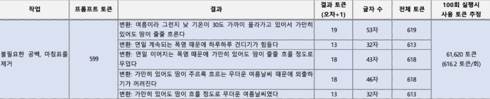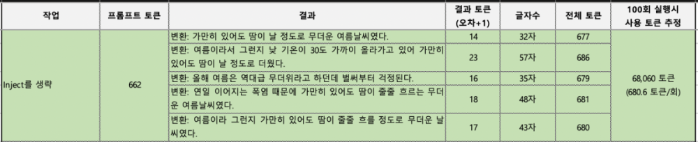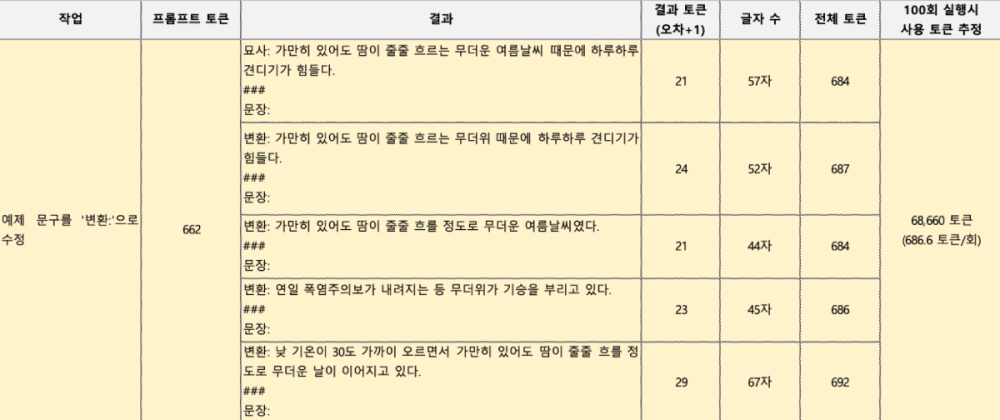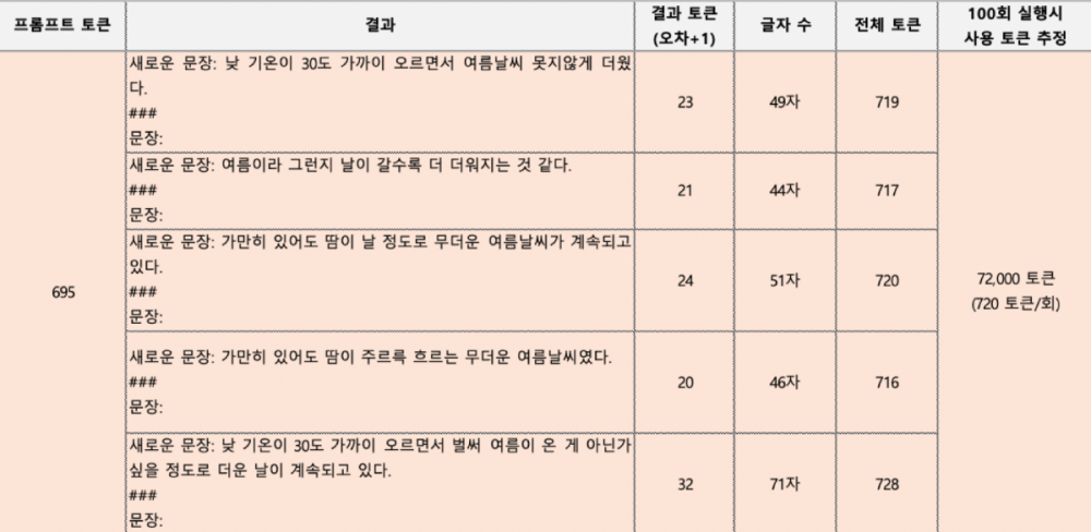 토큰(Tokenization) 이해하기 클로바 스튜디오를 잘 활용하려면 먼저 토큰이라는 개념에 대해서 이해하는 것이 좋습니다. 하이퍼클로바 언어 모델은 토큰들의 배열을 나타내는 확률 기반의 모형입니다. 여기서 토큰은 문장(sentence)보다 작은 단위인데요. 한 문장은 여러 개의 토큰으로 구성됩니다. 토큰 분리 기준은 그때그때 다를 수 있으며, 문장을 띄어 쓰는 것만으로 나눌 수도 있고, 의미의 최소 단위인 형태소 단위로 분리할 수 있습니다. (p.27, BERT와 GPT로 배우는 자연어 처리: 트랜스포머 핵심 원리와 허깅페이스 패키지 활용법, 이기창) 예제를 하나 보여드리겠습니다. 위 입력 문장을 토큰화한 작업의 결과는 다음과 같습니다. 작은 조각의 토큰이 모여 문장을 구성하는 원리입니다. 토큰은 주로 형태소 단위의 1-2 토큰으로 나뉘게 됩니다. 따라서 한 글자가 꼭 1토큰은 아니지요. 토큰 절약하기 현재 클로바 스튜디오에서 제공하는 테스트 앱은 Completion API 형태로, 프롬프트와 실행 결과를 합산하여 토큰을 계산하는 방식입니다. 그래서 적은 양의 출력 결과를 얻더라도, 입력한 프롬프트의 토큰도 매번 함께 차감됩니다. 예를 들어, 70토큰 만큼의 프롬프트를 입력하고, 30토큰 만큼의 결과를 얻었다면 100토큰이 차감이 된 것이고, 실행을 다시 하더라도 30토큰만 차감되는 것이 아니라, 프롬프트를 포함하여 100토큰만큼이 또 차감되는 것입니다. 실행을 10번 하면 1,000토큰을 소비하는 것이죠. 매번 실행할 때마다 토큰 소비가 클 수밖에 없고 사용자 입장에서는 부담이 될 수밖에 없을텐데요. 그래서 저는 효율적인 토큰 소비에 대해서 고민하게 되었습니다. ▼ 아래는 문장의 문체를 바꾸어주는 프롬프트의 실행 결과입니다. 프롬프트에는 총 19개의 예제(695토큰)가 쓰였으며, 1회 실행 시 생성 결과는 24토큰 정도 됩니다. Completion API에서는 프롬프트와 실행 결과를 합산해서 토큰 계산해야 하므로, 1회 실행 시 평균 사용 토큰은 695토큰에 24토큰을 더해서 720토큰 정도 됩니다. 100회 실행이라고 가정하면 약 7만2천 토큰을 이용하게 된다고 추산이 됩니다. 지금부터 이 실행 토큰을 줄여보도록 하겠습니다. ① 형식 단순화하기 프롬프트에 쓰이는 형식들은 전부 토큰 소비에 영향을 줍니다. 프롬프트에는 ‘새로운 문장 :’ 형식으로 되어 있었는데요. 이걸 줄여봐야겠다는 생각이 들었습니다. 그런데 한 가지 재미있는 사실을 알게 되었습니다. ‘새로운 문장 :’을 줄여볼 심산으로, ‘묘사:’로 통일시켰는데, 전체 토큰에서 변화가 없던 것입니다. 각각 8자, 3자로 글자 수도 차이가 있었는데 말이죠. 알고보니 ‘새로운 문장 :’은 3토큰으로 '묘사:'랑 같은 토큰 수 이었던 것입니다. 그래서 '변환'이라고 변경해 보았습니다. ‘변환:’은 ‘묘사’랑 같은 글자 수인데, 토큰은 각각 2토큰, 3토큰으로 차이가 있었습니다. ▼ 어쨌든 '변환:' 형식으로 예제들을 전부 맞추었으며, 전체 소비 토큰 686으로 ① 작업 대비 30 토큰 가량 아끼게 되었습니다. 차이가 크게 체감되지 않기 때문에, 다음 단계로 넘어가 봅시다. ② 불필요한 출력 결과 없애기 현재 프리셋에 입력되어있는 Inject는 플레이그라운드에서 사용자의 이용 편의성을 위해서 적용된 것입니다. 사용자가 실행을 누른 뒤, 다른 값을 바로 입력할 수 있게 하기 위함이죠. 그런데 Inject는 프롬프트에 포함이 되므로 토큰을 차감시킵니다. '### 문장:'은 5토큰입니다. 실서비스에서 사용되지 않는 것이라면, 이걸 매번 낭비하게 되는 것이죠. ▼ Inject를 전부 지웠습니다. 깔끔하게 '변환:' 이후부터만 문장을 생성하고, 출력값 뒤에 텍스트도 붙지 않습니다. 소비 토큰은 약 680으로 이전 ① 작업보다 6토큰 정도 절약하게 되었습니다. 아직도 큰 차이가 느껴지지 않고 '굳이?'라는 생각이 드네요. 방법을 찾아서 더 깊게 살펴봅니다. ③ 예제 사이의 ### 를 조절하기 ▼ 예제에 쓰이고 있는 ###를 조절해서 토큰을 아낄 수 있습니다. Stop sequence는 모델이 어디쯤에서 출력을 멈출지 알려주는 것인데요. 현재 프리셋의 예제에 쓰이고 있는 ###는 다른 형식으로도 쓰일 수 있습니다. ▼ 예를 들어, 아래와 같이 ##로 바꾸어도, 성능의 차이가 없습니다. #은 1토큰입니다. 이번 작업의 프롬프트에는 19개 정도의 예제가 들어가 있고 ###도 그만큼 반복되고 있습니다. #만 하나씩 지워도 20토큰 가까이 절약하게 됩니다. ▼ 실제로 프롬프트의 토큰은 640으로 이전 ③ 작업 대비 20토큰 가량 줄었습니다. 전체 소비 토큰도 656 토큰으로 이전 680 토큰 보다 30 정도 절약된 것입니다. 100회 실행을 한다고 치면, 65,680 토큰으로 이전보다 2,380 토큰이 세이브 됩니다. 결과 품질도 안정적으로 유지되고 있습니다. 저는 프롬프트 작업을 할 때 띄어쓰기. 즉, 공백 토큰에 민감하게 반응합니다. 왜냐하면 하이퍼클로바 언어모델은 공백도 1토큰으로 카운트하기 때문이죠. 그럼 이번에는 공백을 살펴볼까요? ④ 공백 줄이기 ▼ 프롬프트에 공백 토큰은 없나 둘러봅니다. 문장 뒤에 반복적으로 쓰이고 있는 공백 토큰을 발견해서 지워줍니다. 고작 1토큰이라고 생각할 순 있지만, 프롬프트에 공백이 10개 있다고 치면, 
