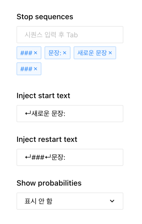 안녕하세요, @ascent님, 클로바 스튜디오 담당입니다. 답변이 늦어져 죄송합니다. inject start text에서 "\n부제: "를 "\n부제:"로 뒤에 붙어있는 띄어쓰기(공백)를 지우시고, 시도해보시겠어요? 플레이그라운드에서는 뒤에 공백이 붙은 경우 공백을 제거해서 실행해주는 로직이 들어가 있습니다. 공백이 붙은 상태로 실행하면 정상적이지 않은 결과가 나올 가능성이 생깁니다. 따라서 뒤에 공백이 붙은 상태에서 실행하는 것보다는, 공백을 제거하고 실행하시는 것을 권장드립니다. 감사합니다.