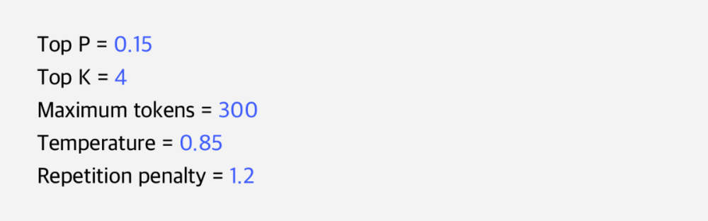 안녕하세요 🙂 가이드의 오류는 수정을 검토하겠습니다. 각 파라미터 설정값의 범위를 알려드립니다. Top P: 0~1.0 Top K: 0~128 Maximum tokens: 0~2048 Temperature: 0~1.0 Reptition penalty: 0~10 Top P는 "Top P가 누적 확률 값 범위에 포함된 토큰을 후보로 선택하는 개념"이 맞습니다. API 문서의 문구를 수정하겠습니다. 토큰에 페널티를 적용하는 점에서 OpenAI에서 제공하는 penlaty와 유사합니다. 다만 OpenAI의 경우 presense(토큰이 기존에 최소 1회 노출) / frequency(같은 토큰이 여러번 노출)로 조건을 세부화시킨 듯 합니다. 이 부분은 OpenAI의 문서를 참고하시면 좋을 것 같습니다. 감사합니다.