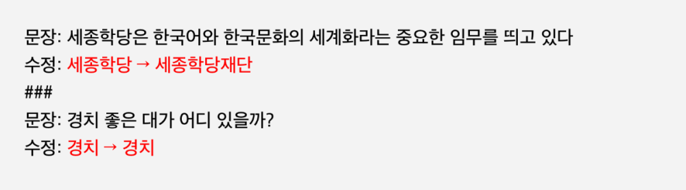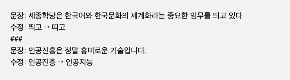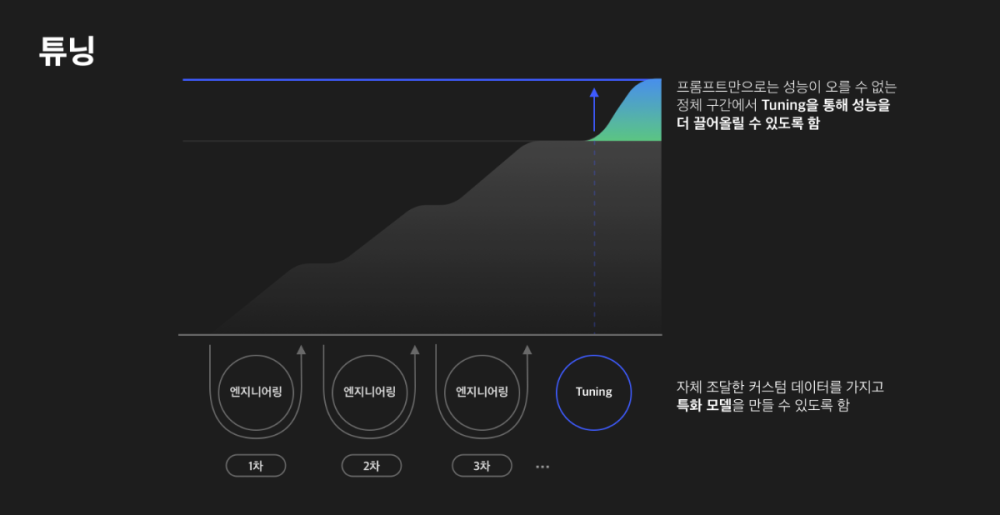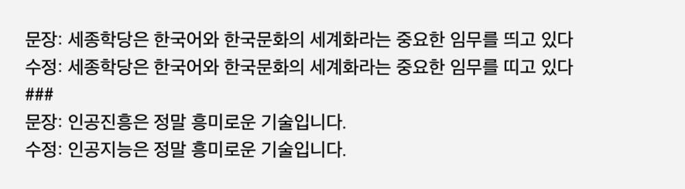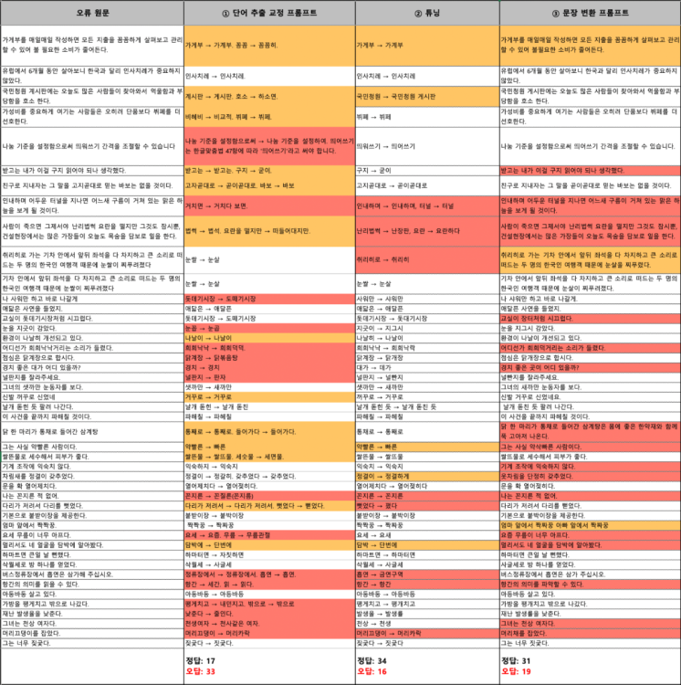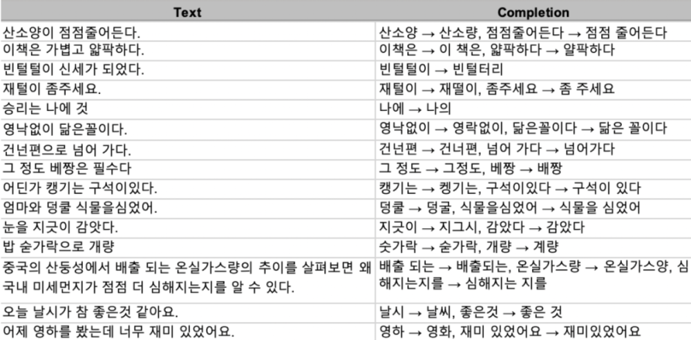 성능 끌어 올리기 클로바 스튜디오에서는 프롬프트 작업을 한 번 실행하는 것에서 그치는 것이 아니라 개발 프로세스상에서 수정과 검증을 반복하는 과정을 거쳐야 합니다. 차수별로 생성 결과에 대해서 품질을 평가하며 60~70점 수준의 성능까지 끌어올릴 수 있도록 합니다. 이 과정을 통해 최적화된 프롬프트를 완성하는 것이죠. 우리는 이것을 프롬프트 엔지니어링이라고 부릅니다. 하지만 플레이그라운드에서 작업을 하다 보면 원하는 결과가 나오지 않는 상황에 직면하게 됩니다. 아무리 파라미터 조절을 하고 프롬프트를 수정해도 기대하던 결과와 다르게 나오는 것이죠. 기본 모델(Backbone model)로는 성능 개선의 한계에 도달했기 때문입니다. 클로바 스튜디오는 이런 문제들을 해결할 방법을 가지고 있습니다. 바로 ‘튜닝’이죠. 사용자가 보유한 데이터셋을 가지고 모델을 최적화시킬 수 있습니다. ▼ 튜닝을 활용하면 작업 성능이 오르지 않던 정체 구간에서, 성능을 끌어올릴 수 있습니다. 저는 오늘 여러분께 프롬프트로 잘 안되던 작업을 튜닝해서 가능해지도록 한 사례를 공유해 드리려고 합니다. ▼ 클로바 스튜디오에서는 맞춤법 교정기를 쉽게 만들 수 있는데요. 여타 맞춤법 서비스와 비교를 했을 때 성능도 꽤 괜찮은 편입니다. 하지만 저는 다른 형식으로 출력되기를 희망했습니다. ▼ 문장에서 교정이 필요한 단어를 추출한 뒤, 화살표(→) 표기를 가지고 수정된 단어를 보여주는 형식을 원했습니다. ▼ 그렇지만 실행 결과가 좋지 않았습니다. 틀리지 않은 단어를 수정하거나, 다른 단어로 대치시켜버리는 등의 문제가 있었습니다. 여기서 저는 한 가지 의문을 품게 되었습니다. 오류 문장을 교정된 문장으로 변환하는 방식은 잘 되는데, 어째서 오류 문장을 {단어} → {단어 교정} 형태로는 잘 안되는 것일까요? 이 문제를 해결하기 위해 튜닝 기능을 사용해봤습니다. 그럼 지금부터, 좋은 결과를 내지 못했던 작업을, 좋은 결과를 낼 수 있는 작업으로 개선했던 사례를 공유하겠습니다. 튜닝, 꼭 해야 해요? ① 현재 플레이그라운드에는 2048 토큰이라는 제약 조건이 있는데요, 튜닝을 이용하면 이러한 제약 조건 없이 예제를 더욱 다양하게 구성할 수 있습니다. ② 원하는 방식으로 데이터셋을 구성하여, 니즈에 적합한 방향으로 출력이 될 수 있도록 할 수 있습니다. ③ 모델을 학습하면, 모델이 가벼워지며 Task의 수행 시간 단축되고 비용을 절감할 수 있습니다. 데이터셋을 모으는 일 튜닝을 시작하기에 앞서 가장 중요한 것이 바로 데이터셋입니다. 데이터셋을 이미 보유하고 있다면 괜찮으나, 데이터셋이 없는 경우 데이터를 확보하는 데에 시간이 오래 걸릴 수 있습니다. 튜닝으로 좋은 성능을 내려면 최소 1,000건 이상의 데이터가 필요하기 때문이죠. ① 맞춤법 데이터는 어디서 모았나요? 네이버 국어사전 퀴즈, 네이버 국어사전 우리말 바로쓰기, 국립국어원 온라인 가나다, 모두의 말뭉치, 외에도 인터넷상에서 수집한 자주 틀리는 맞춤법 자료들을 참고하여 수동으로 하나씩 직접 작성했습니다. ② 1,000개 데이터를 모으는 데 얼마나 걸렸나요? 개인당 작업 분량에는 다소 차이가 있으나, 4명이 참여했으며 데이터셋 1,200개만큼 모으는 데에 8~9일 정도 소요되었습니다. 다만, 맞춤법의 경우 대부분 정답이 명확히 있기 때문에 다른 유형의 작업보다는 수월한 편일 듯합니다. 반면에 중복되지 않은 새로운 데이터를 구하는 것은 힘들었습니다. ③ 데이터를 쉽게 불릴 방법은 없을까요? 적은 데이터를 가지고 수 배의 데이터로 늘릴 수 있는 ‘데이터 확장(Data Augmentation)’ 기능을 곧 공개합니다. ④ 데이터셋을 구할 수 있는 곳이 있나요? 현재 여러 기관에서 데이터를 개방하여 모두가 쉽게 용이하게 활용할 수 있도록 하고 있습니다. 단, 실서비스 제공을 위해서는 별도 약관 확인 및 법무 검토가 필요할 수 있습니다. AI-Hub (https://www.aihub.or.kr/) 모두의 말뭉치 (https://corpus.korean.go.kr/) 공공데이터포털 (https://www.data.go.kr/) 농식품 빅데이터 거래소 (https://kadx.co.kr/product) Hugging Face (https://huggingface.co/datasets) 본격! 튜닝 시작하기 데이터셋은 csv 혹은 json 형식을 지원합니다. 파일의 첫 번째 행은 Text, Completion이 포함되어 있어야 하며, 총 두 개의 열로만 구성되어야 합니다. ▼ Text 열에는 맞춤법이 틀린 문장을 넣고, Completion 열은 {단어} → {단어 교정} 형태로 구성했습니다. ▼ 모델 엔진을 선택합니다. 자세한 튜닝에 대한 가이드는 다음 링크에서 확인하실 수 있어요. (가이드 보기) ▼ 튜닝 학습이 완료되면 상세 페이지에서 인퍼런스 테스트를 할 수 있습니다. 입력하면 학습된 모델로 출력한 결과를 확인할 수 있지요. 자, 이제 결과를 살펴볼까요! ▼ 문장을 입력하면 {단어} → {단어 교정} 형태로 맞춤법을 교정해주고 있습니다. ▼ 간단한 띄어쓰기를 고쳐주기도 하고요. ▼ 오타를 찾아서 교정합니다. ▼ 문장을 조금 바꾸어 입력해도 맞춤법을 교정해주는 것을 확인할 수 있습니다. ※ 한 가지 알아둘 점은 현재 튜닝은 아래와 같은 인퍼런스 파라미터를 기본으로 하고 있는데요. 파라미터 조절로도 출력 결