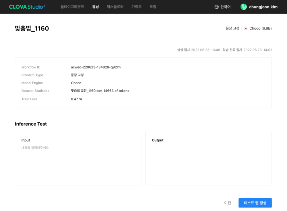 안녕하세요, @nsjpa님, 클로바 스튜디오 기획 담당입니다. 1. 튜닝을 진행하면 해당 계정에 한해서 튜닝 모델 이용이 가능합니다. 튜닝된 작업물이 기본 모델이 추가되지 않습니다. 현재 플레이그라운드에서 튜닝된 모델을 불러오는 기능은 제공하지 않으며, 검토중에 있습니다. 튜닝 작업을 수행하신 뒤 테스트앱을 발급하시어, API 연동 및 파라미터 조절등을 하실 수 있습니다. 각각 서로 다른 튜닝 작업을 진행하신 것은 누적되는 방식이 아닙니다. 따라서 튜닝 작업을 수행하신 뒤 또 다른 튜닝 작업을 수행하시는 것은 별개의 작업이며, 마찬가지로 토큰이 중복 차감될 수 있습니다. 2. 현재 플레이그라운드에서 해보았을때, 말씀하신대로 결과가 잘 나오지 않았습니다. 아래와 같이 프롬프트 예제를 더 추가하였더니, 정답에 가깝게 출력되었습니다. 아무래도 이런류의 작업은 2048 토큰의 제약 때문에 예제를 많이 넣을수 없을텐데요. 짧은 유형의 예제들로 구성해보시는건 어떨까요? 원문에 없는 키워드가 추출되는 문제는 튜닝을 통해서 개선이 될 수 있으리라 생각됩니다.