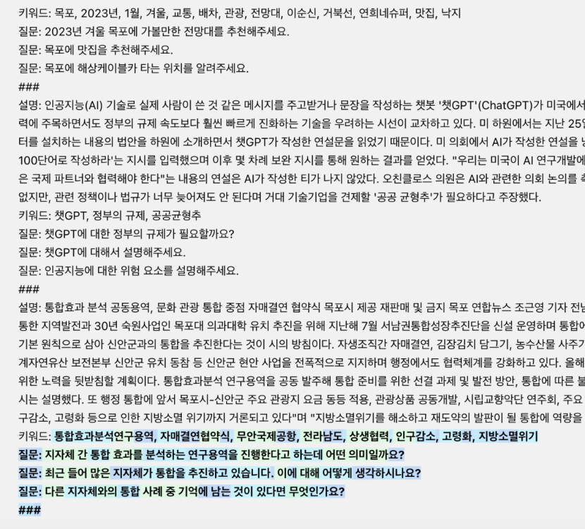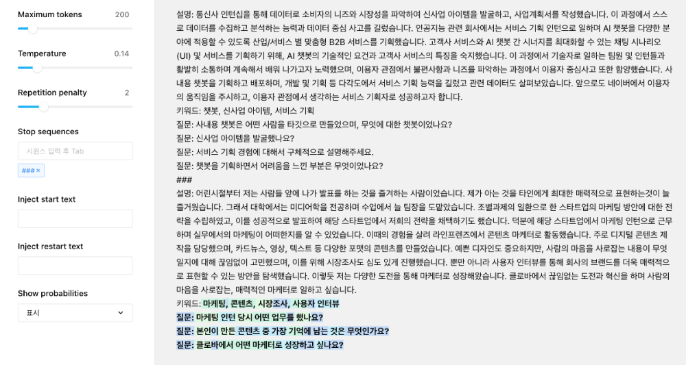 안녕하세요, @nsjpa님, 클로바 스튜디오 담당입니다. 1. Inject start text의 경우, 모델의 출력 결과 앞에 단순히 텍스트를 밀어넣는 것이라, Inject에 ↵키워드:↵질문: 를 입력하는 방식으로는 두 항목이 각각 출력할 수는 없습니다. ▼ 아래와 같이 프롬프트에 '키워드', '질문'을 예제로 구성하시고, 실행하시면, 설명에 해당하는 키워드와 질문을 생성할 수 있습니다. 2. - 플레이그라운드에서 작업하신 내용들은 자동 학습되지 않습니다. - 네, 업로드하시는 데이터셋에 최적화된 형태로 문장이 생성됩니다. - 튜닝을 하고나면, 튜닝 상세 페이지에서 인풋을 넣고 결과를 테스트해보실 수 있는데요. 이때 파라미터는 가장 최적화된 값으로 설정되어 있습니다. 테스트 앱 발급을 통해 튜닝 모델의 파라미터 변경이 가능합니다. - 초거대 언어모델의 부족한 부분은 아마도 시의성일 것입니다. 프롬프트에 날짜에 대한 힌트를 넣으면, 해당 날짜를 기준으로 출력을 할 수 있을텐데요. 프롬프트에 기반해서 출력한 것이지 정확한 오늘 날짜가 나오기는 어려울 듯 합니다. 감사합니다.