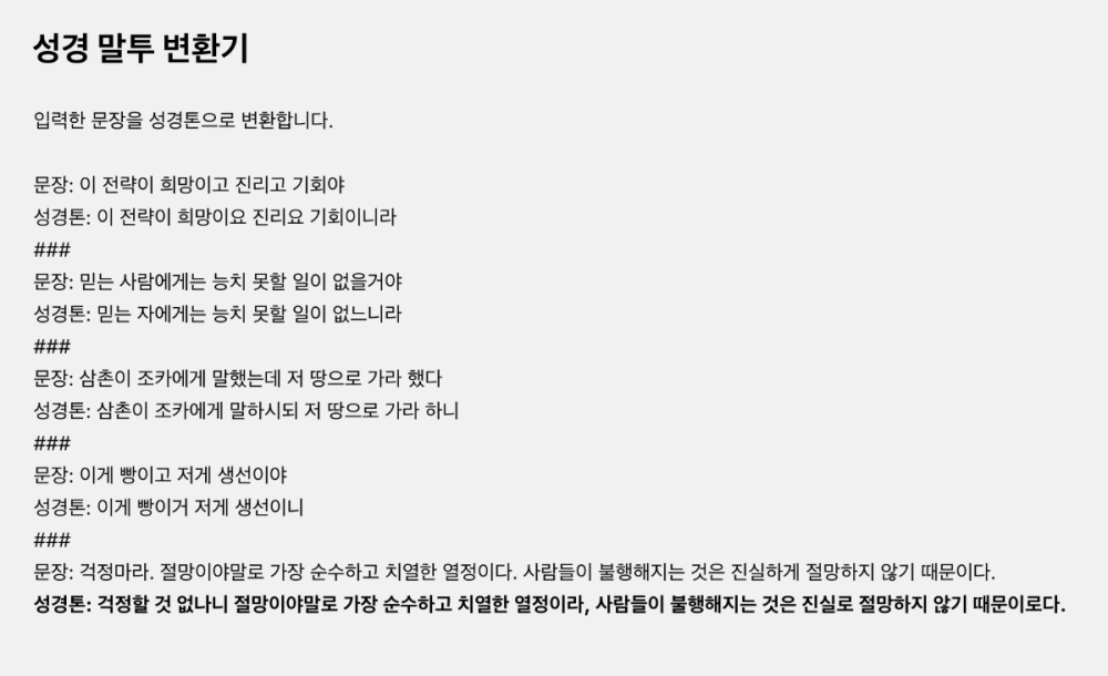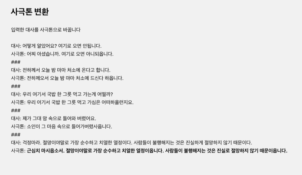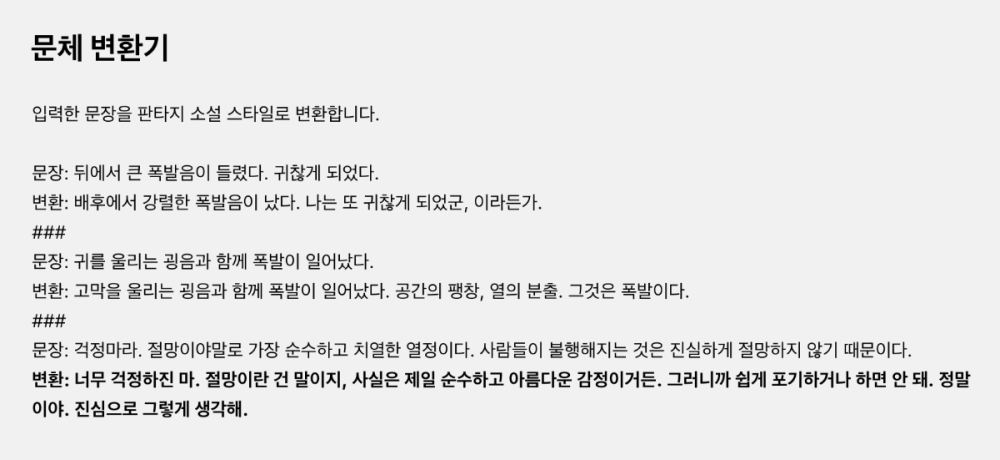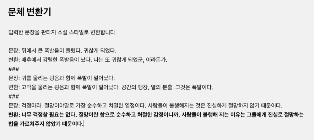 1. 안녕하세요. CLOVA Studio 입니다. 😁 글은 누구나 쓸 수 있습니다. 그런데 글에 특별함을 더하는 것은 무엇일까요? 바로 '문체'입니다. '문체'는 글을 쓰는 스타일을 말합니다. 문장을 어떻게 표현하느냐에 따라서 글의 색채가 달라지죠. 같은 문장이라도 표현의 기교를 통해서 개성이 드러나기도 합니다. "스타일은 문체와 같은 것이고, 문체는 곧 주제다." (Mark Schorer) 다음은 이문열 소설가의 '젊은 날의 초상'에서 가져온 문장입니다. "걱정마라. 절망이야말로 가장 순수하고 치열한 열정이다. 사람들이 불행해지는 것은 진실하게 절망하지 않기 때문이다." 하이퍼클로바가 이 문장을 어떻게 가지고 노는지 보여드리겠습니다. 걱정말라, 절망이 제일 순수하다카이! 사람들이 불행해 지는건 진짜 절망안해서 그렇다 아이가" 라고 경상도 사투리로 바꾸어주었네요. 다음은 사극톤으로 변환해보겠습니다. 사극 드라마에서 나올법한 대사를 예제로 넣었습니다. "근심치 마시옵소서. 절망이야말로 가장 순수하고 치열한 열정이옵니다. 사람들이 불행해지는 것은 진실로 절망하지 않기 때문이옵니다." 로 바꾸어주었네요. 특히 '걱정마라'를 '근심치 마시옵소서'로 바꾼 것이 재미있네요. 성경 말투라고 들어보셨나요? 성경은 특유의 어조가 드러나는 편이죠. HyperCLOVA를 통해 성경톤으로 바꾸어보겠습니다. 평범한 문장과 성경톤으로 바꾼 문장을 예제로 넣었습니다. "걱정할 것 없나니 절망이야말로 가장 순수하고 치열한 열정이라, 사람들이 불행해지는 것은 진실로 절말하지 않기 때문이로다."라고 변환을 하였네요. '걱정마라.'를 보조용언 -나니를 통해 '걱정할 것 없나니 절망이야말로...' 라고 섬세하게 변환한 것이 보이시나요? 문체의 힘은 대단하다! 하루키는 음악을 연주하듯이 글을 쓴다고 합니다. 단어의 조합, 딱딱함과 부드러움, 무거움과 가벼움, 균형과 불균형의 조합, 톤의 조합에 의해 글에 리듬이 생긴다고 합니다. 평범할 수 있는 문장을 좀 더 다채로운 문장으로 변환해보겠습니다. 웹 소설에서 쓰일법한 문체를 예제로 넣었습니다. "너무 걱정하진 마, 절망이란건 말이지, 사실은 제일 순수하고 아름다운 감정이거든. 그러니까 쉽게 포기하거나 하면 안 돼. 정말이야. 진심으로 그렇게 생각해" 라고 소설 속 인물이 말하듯이 변환되었네요. 표현을 좀 더 적극적으로 바꾸어볼까요? Temperature를 0.85로 변경을 하고 실행해보았습니다. "너무 걱정할 필요는 없다. 절망이란 참으로 순수하고 처절한 감정이니까. 사람들이 불행해 지는 이유는 그들에게 진실로 절망하는 법을 가르쳐주지 않았기 때문이다."로 변환되었습니다. 해석의 차이는 약간 생기겠지만, 좀 더 극적인 표현을 하는 듯합니다. 어때요? 참 쉽죠? HyperCLOVA Studio를 가지고 다양한 리듬으로 글을 써보면 어떨까요? 이상, Text Generation에 대한 설명이었습니다! ❗더 많은 CLOVA Studio 사용 예시는 여기에서 확인해 주세요.