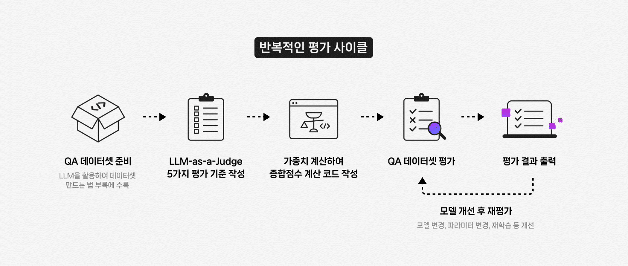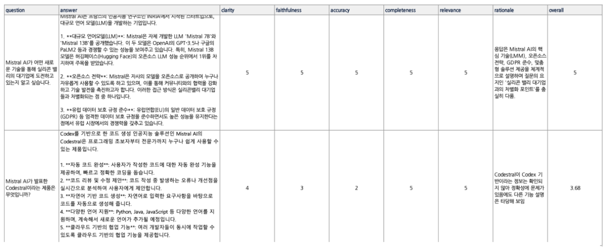 LLM Evaluation, 왜 중요한가? LLM은 이제 단순한 텍스트 생성기를 넘어, RAG(Retrieval-Augmented Generation)나 Fine-tuning과 같은 기법을 통해 실제 서비스와 업무 환경에 맞게 커스터마이징되고 있습니다. 하지만 새로운 파이프라인을 설계하거나 파인튜닝을 적용했다고 해서, 성능이 항상 향상되는 것은 아닙니다. 실제로 개선 여부를 객관적으로 검증하는 일은 여전히 쉽지 않죠. 기존 벤치마크 점수로는 실제 현장의 요구를 충분히 반영하기 어렵고, 사람 평가만으로는 시간과 비용의 부담이 큽니다. 이 한계를 보완하기 위해 최근 주목받는 접근이 LLM-as-a-Judge입니다. 또 다른 LLM이 평가자의 역할을 맡아, 생성된 결과물의 품질을 판별하고 점수를 매기는 방식이죠. 이를 통해 대규모 평가를 자동화하고, 인간 평가가 지니는 주관성을 줄일 수 있습니다. 이 방식은 단순히 모델이 '잘 작동하는가'를 확인하는 수준을 넘어, 어떤 조건에서 강점을 보이고 어디에서 취약한지까지 체계적으로 파악할 수 있게 합니다. 최근 연구에 따르면, LLM-as-a-Judge는 단순한 평가 자동화를 넘어서 모델이 스스로 사고 과정을 평가하고 개선하는 ‘Reasoning-Centric’ 방향으로 발전하고 있습니다¹. 즉, 평가와 추론이 서로를 보완하며 모델의 사고 구조를 점점 더 정교하게 만들어가는 흐름입니다. (1) Gu, Jiawei, et al. 2024. "A Survey on LLM-as-a-Judge." https://arxiv.org/abs/2411.15594. CLOVA Studio에서는 이러한 평가 방식을 HyperCLOVA X 모델 API를 직접 활용해 구현할 수 있습니다. 생성된 결과를 자동으로 평가하고, 그 데이터를 다시 프롬프트 최적화나 파인튜닝 전략 조정, RAG 파이프라인 개선에 활용하는 것이죠. 왜 추론 모델로 평가해야 할까 LLM 성능 평가는 비추론 모델의 출력만으로는 한계가 있습니다. 답을 생성하는 데는 능숙하더라도, 그 답이 왜 맞거나 틀렸는지를 스스로 검증하지 못하기 때문이죠. 이 경우 결과의 일관성이 떨어지고, 평가 근거도 불명확해질 수 있습니다. 반면 HyperCLOVA X의 추론 모델 HCX-007은 결론에 이르기 전, 단계별 사고 과정을 전개하며 전제와 논리를 점검합니다. 이런 사고 과정 덕분에 평가 결과는 단순히 정답인지 아닌지를 판단하는 수준을 넘어, 더 깊이 있는 분석으로 이어집니다. 실제로, Judging LLM-as-a-Judge with MT-Bench and Chatbot Arena 연구에서는 GPT-4와 같은 추론형 모델이 인간 평가자와 약 80 % 수준의 일치도를 보였다고 보고했습니다. 이는 LLM-as-a-Judge가 인간 선호(human preference)를 대체할 수 있을 만큼 신뢰도 높은 평가 체계로 작동할 수 있음을 보여줍니다. (2) Zheng, Liang, et al. 2023. “Judging LLM-as-a-Judge with MT-Bench and Chatbot Arena.” https://arxiv.org/pdf/2306.05685. 추론 모델을 평가자로 쓸 때의 세부 강점은 다음과 같습니다. 논리 일관성 검증 정답 여부만 확인하는 데 그치지 않고, 사고 과정을 기반으로 논리적 타당성까지 함께 검증합니다. 평가 결과에는 판정 근거까지 함께 남기기 때문에, 왜 그런 결과가 나왔는지도 명확히 파악할 수 있습니다. 세분화된 기준별 평가 Clarity, faithfulness, accuracy 등 항목별로 일관된 스코어링이 가능해, 같은 답변이라도 어떤 부분이 강점이고, 어디서 약한지 명확히 구분해 보여줄 수 있습니다. 설명 가능한 근거 제시 점수뿐 아니라 평가 근거와 판단 과정이 함께 제공되어, 결과의 신뢰도를 높입니다. 부분 정답 처리 모호하거나 부분적으로만 맞는 응답도, 합리적인 기준에 따라 부분 점수와 보완 코멘트를 함께 제공합니다. 즉, HCX-007은 ‘스스로 사고하며 분석하는 평가자’입니다. 이를 평가 파이프라인에 도입하면, 점수의 신뢰성과 결과에 대한 이해도가 높아지고, 이후 모델 개선 사이클을 더 빠르게 반복할 수 있습니다. 이번 글에서는 CLOVA Studio의 HCX-007 추론 모드로 LLM 평가를 설계하고 적용하는 방법을 구체적으로 살펴보겠습니다. LLM Evaluation 시나리오 전체 프로세스 개요 아래 다이어그램은 이번 글에서 다루는 LLM 평가 워크플로우를 단계별로 정리한 것입니다. 이 프로세스는 단순히 한 번의 점수를 계산하는 데 그치지 않고, 평가 → 개선 → 재평가의 순환 구조를 통해 모델을 지속적으로 고도화하는 것을 목표로 합니다. 단계별 설명에 들어가기 전에, 우선 평가에 사용할 QA 데이터셋이 필요합니다. 아직 준비되지 않았다면 부록에 안내된 절차를 참고해 손쉽게 생성할 수 있습니다. 데이터셋은 Excel(.xlsx) 또는 CSV(.csv) 형식을 모두 지원하며, 두 개의 열; 질문(question) 과 답변(answer)로 구성되어 있어야 합니다. 1. 평가 기준 정의하기 LLM-as-a-Judge 방식을 적용하려면, 먼저 평가 기준을 명확히 설정해야 합니다. 아래는 LLM의 응답을 평가하기 위해 HCX-007 모델에 전달할 시스템 프롬프트의 예시입니다. JUDGE_SYSTEM_PROMPT = """당신은 LLM 응답을 평가하는 심판(LLM-as-a-Judge)입니다. [역할] - 주어진 질문(question)과 응답(answer)을 기준으로, 아래 항목별로 0~5의 정수 점수를 부여하고 간단한 근거를 제시합니다. - 외부 지식이 필요하더라도, 질문과 응답에 드러난 정보와 일반 상식 범위를 벗어나 추정하지 않습니다. (추정 시 근거 부족으로 감점) [원칙] # 원하는 모델 방향성에 맞게 조정 가능 - 점수는 반드시 0~5의 **정수(