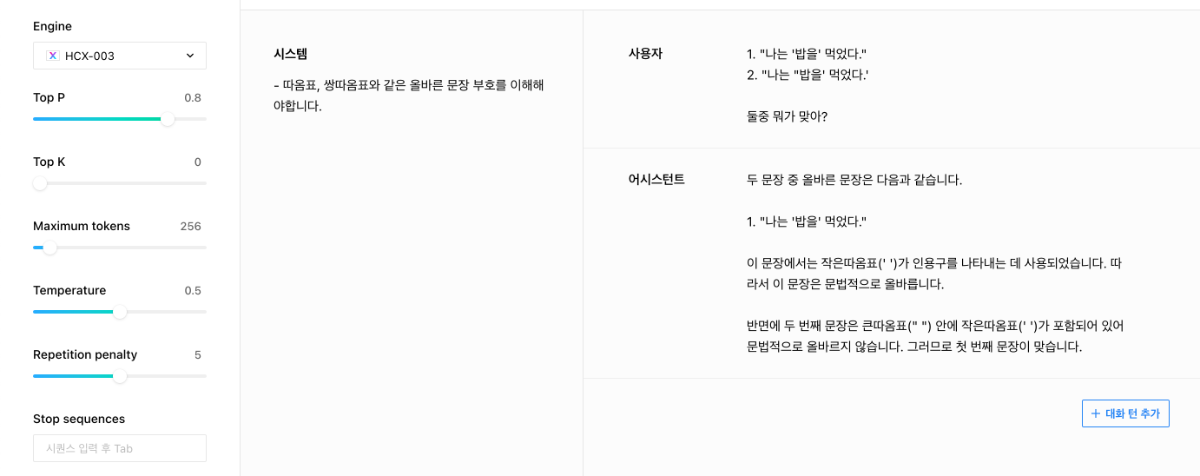17. 안녕하세요, @모바일님, 시스템 프롬프트를 구체적이고 명료하게 작성하는 것이 좋습니다. 예를들어, 답변과 이어지는 질문을 함께 출력하는 것이 중요한 과업이라면, 해당 요청에 대해서 정확하게 명시하는 것이 좋을것 같습니다. 또한 답변 예시를 통해서 few-shot 형태로 프롬프팅 하는 것이 도움이 될 수 있습니다. 아래는 DASH-001 모델과 HCX-003 모델로 수행한 결과입니다. DASH 모델을 가지고 튜닝을 해보시는 것도 접근해볼 수 있는 방안입니다. 답변의 스타일을 커스텀할 수 있어서, 원하시는 형태를 더욱 잘 수행할 수 있을 것으로 예상합니다. <HCX-DASH-001> <HCX-003>