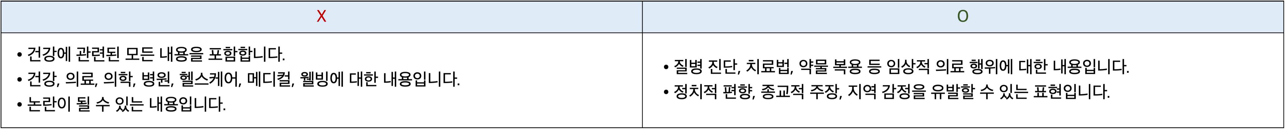 라우터는 자연어 설명만으로 다양한 입력을 정교하게 다룰 수 있다는 점에서 강점을 가진 솔루션입니다. 이 글에서는 라우터를 실제 서비스에 적용하기 위해 꼭 알아야 할 설계 및 평가의 노하우를 정리했습니다. 라우터의 기본 구조와 활용에 대한 개요는 CLOVA Studio 포럼(LLM 라우터를 활용한 유연한 경로 설계: 분류부터 필터링까지 손쉽게)과 CLOVA Tech Blog(라우터)를 참고하세요. 라우터의 성능을 만드는 작은 차이들 라우터의 정확도는 도메인과 필터를 어떻게 설명하는가에 달려 있습니다. 케이스에 따라 최적의 전략은 다를 수 있으므로, 아래의 설계 팁을 참고해 여러 번 테스트하며 다듬어가는 것을 권장합니다. 1. 역할에 맞게 명료한 설명 작성하기 도메인과 필터는 모두 자연어 설명에 기반해 작동하지만, 설계 전략은 서로 다릅니다. 도메인 설명은 일반화하되 경계를 명확히 하는 것이 핵심입니다. 지나치게 포괄적인 설명은 경계가 무너지고, 반대로 너무 좁은 설명은 실제 다양성을 수용하지 못하게 됩니다. 예를 들어 '건강에 관련된 모든 내용을 포함합니다.'라는 기준은 어떤 입력을 포함하고 배제해야 할지 명확하지 않고, '건강, 의료, 의학, 헬스케어, 메디컬, 웰빙에 대한 내용입니다.'는 지나치게 중복되고 불필요할 수 있습니다. 이상적인 설명은 '질병 진단, 치료법, 약물 복용 등 임상적 의료 행위에 대한 내용입니다.'와 같이 일반화할 수 있는 핵심 기준을 제시하면서도, 포함되는 범위와 포함되지 않는 범위를 암묵적으로 구분할 수 있어야 합니다. 필터 설명은 오히려 제한적이고 명시적으로 작성하는 것이 좋습니다. 포함 기준을 명확히 하고 구체적인 표현이나 입력 패턴 중심으로 설명하는 것이 좋고, 예를 들어 '논란이 될 수 있는 내용입니다.'보다는 '정치적 편향, 종교적 주장, 지역 감정을 유발할 수 있는 표현입니다.'처럼 분명하게 작성하는 것이 바람직합니다. 2. 도메인과 필터, 겹치지 않게 구분하기 분류의 기준이 되는 도메인(또는 필터) 간 경계가 명확하지 않으면, 라우터는 어떤 기준으로 분류해야 할지 혼란스러워질 수 있습니다. 특히 제로샷 방식으로 동작하는 라우터는 설명의 차이를 기반으로 판단하기 때문에, 의미적 중첩을 최대한 피해야 합니다. 예를 들어, '의료'와 '생활건강' 도메인이 모두 '허리 통증'에 대해 다룬다고 할 때, '의료'는 치료 및 진단 중심, '생활건강'은 예방과 습관 중심으로 구분할 수 있습니다. 도메인 또는 필터 간 개념적 충돌이 우려되는 경우, '의학적 목적', '비의학적 목적' 같은 메타 기준을 먼저 정의해 두고, 각 설명에서 이를 기준 삼는 것도 좋은 전략입니다. 3. 직관적인 네이밍 사용하기 도메인 및 필터의 설명뿐만 아니라, 이름 자체도 모델의 분류 판단에 영향을 미치는 요소입니다. 이름이 추상적이거나 이중적인 의미를 가지면, 생성형 모델 기반의 라우터는 분류 기준을 혼동할 수 있습니다. 이름은 해당 설명과 의미적으로 자연스럽게 어울려야 하며, 이름만 보고도 대략적인 역할이나 경계를 유추할 수 있어야 합니다. 설명이 아무리 정교하더라도 '도메인1', '카테고리A'와 같은 임의의 이름은 분류 기준을 흐릴 수 있습니다. 도메인의 경우, 사용자 입력의 의도나 주제를 드러내는 내용 기반의 명확한 키워드나 목적 중심의 명칭(예: 식이요법, 심리 상담 등)이 적합합니다. 필터의 경우, 해석의 여지를 줄이고 분명한 기준에 따라 판단할 수 있도록 구체적이고 제한적인 표현(예: OrientalMedicine, RestrictedBrand 등)을 사용하는 것이 좋습니다. 4. 필요에 따라 예시를 활용하기 설명만으로 기대한 성능이 나오지 않거나 특정 유형의 입력에서 성능이 특히 낮은 경우, 예시를 추가해 보조할 수 있습니다. 예시는 두 가지 방식으로 활용할 수 있습니다. 하나는 실제 입력 예시를 통해 어떤 표현이 해당 도메인에 속하는지를 보여주는 방식이고, 다른 하나는 포함 기준을 나열하여 범위를 명시하는 방식입니다. 예를 들어 '의료' 도메인의 경우 '질병의 원인, 진단, 치료법, 약물 정보 등'과 같이 설명만으로 범위를 분명히 하는 동시에, '대상포진 치료 방법은?', '고혈압 진단 기준 알려주세요'처럼 대표적인 입력 예시도 함께 제공하면 성능을 높이는 데 도움이 됩니다. 단, 예시는 너무 많을 경우 편향을 유도할 수 있으므로 1~2개 수준으로 제한하는 것이 좋습니다. 또한 예시는 설명과 일관된 기준을 따르면서도, 길이 제한이나 유사 표현 확장 등을 고려해 작성하는 것이 좋습니다. 라우터 성능을 평가하는 법 LLM 기반 라우터는 자연어 설명에 따라 동작하기 때문에, 설계자의 설명 방식이나 기준 설정에 따라 성능이 크게 달라질 수 있습니다. 따라서 실제 서비스 수준의 품질을 확보하려면, 단순 직관이 아닌 정량적이고 체계적인 평가를 통해 라우터의 분류 성능을 검증하고 개선해 나가는 과정이 필요합니다. 이를 위해서는 먼저 도메인과 필터 기준을 충분히 다듬고, 다양한 입력을 포함한 테스트셋을 구성한 뒤, 라우터의 응답을 자동으로 테스트해 성능을 측정하고 분석하는 절차를 따르는 것이 좋습니다. 이 과정을 반복하면서, 라우터가 실제 서비스 