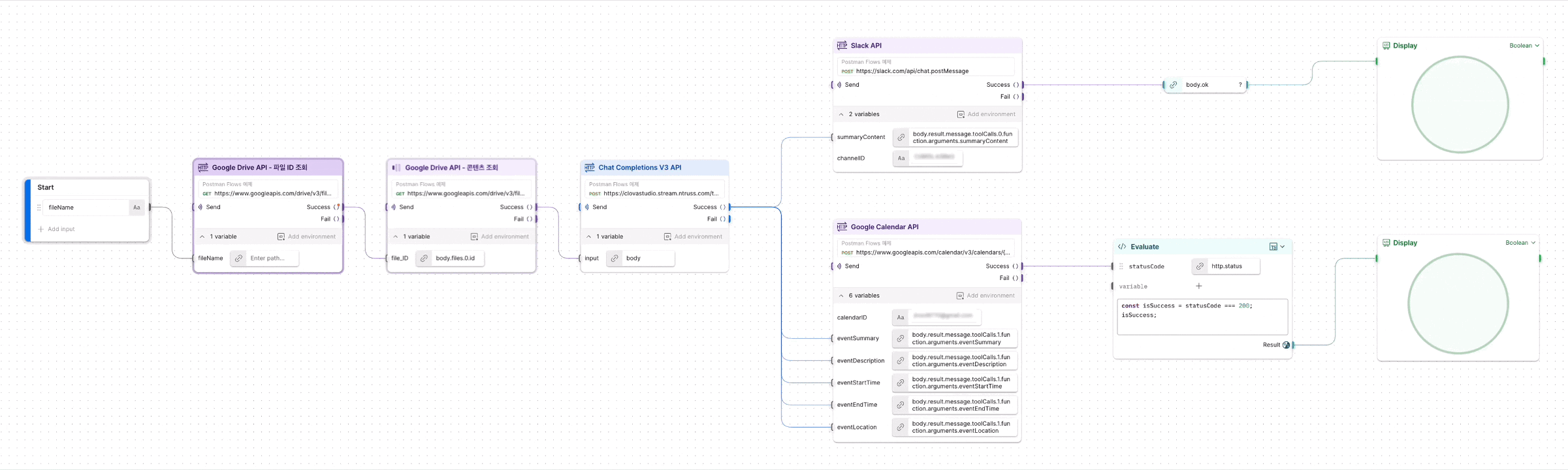 Postman Flows를 활용해 CLOVA Studio API와 외부 API를 시각적으로 연결하고, 실제 애플리케이션처럼 동작하는 워크플로우를 구현하는 방법을 소개합니다. 최근에는 Dify, n8n 등 GUI 기반의 노코드/로우코드 워크플로우 도구들이 등장하면서, 외부 서비스 연동, 조건 분기, LLM 활용 등 복합적인 작업을 시각적으로 구성할 수 있는 환경이 떠오르고 있습니다. 개발 경험이 없는 사용자도 손쉽게 자동화를 설계하고 실행할 수 있도록 돕는 것이 특징인데요, Postman Flows 역시 이러한 흐름에 맞춘 노코드 도구로, API 요청을 시각적으로 연결해 복잡한 자동화 시나리오를 쉽게 구성할 수 있습니다. 이번 예제에서는 여러 API 호출을 순차적으로 연결해 하나의 자동화 시나리오를 완성해 보겠습니다. 1. 시나리오 소개 이번 예제에서는 회의 기록을 요약해 공유하고, 회의 중 나온 일정 정보를 자동으로 캘린더에 등록하는 흐름을 구성합니다. 이를 위해 CLOVA Studio의 Chat Completions V3 API와 Google Drive, Slack, Google Calendar API를 불러오고, 각 단계를 Postman Flows 상에서 시각적으로 연결하여 자동화를 구현합니다. 전체 흐름은 다음과 같습니다. Google Drive에 저장된 회의록 파일을 불러옵니다. Chat Completions V3 API를 통해 회의록을 요약하고, 동시에 회의 중 언급된 일정 및 액션 아이템을 추출합니다. 요약 결과는 Slack 메시지로 전송합니다. 추출된 일정 정보는 Google Calendar에 등록합니다. 2. 사전 준비 본 예제를 시작하기 전에, Google Drive, Google Calendar, Slack API를 연동하기 위한 인증 정보 발급 및 권한 설정 방법을 안내합니다. 2.1 Google Drive 및 Google Calendar API 준비 Google Drive API와 Google Calendar API를 활용하기 위한 설정 방법입니다. 두 API 모두 설정 방식이 동일하므로, 하나의 절차로 함께 안내합니다. 다음 과정에 대한 자세한 설명은 Google Cloud 가이드를 참고하세요. 먼저 Google API를 사용하려면 Google 계정이 필요하며, Google Cloud Console에 로그인할 수 있어야 합니다. 프로젝트 생성 Google Cloud Console에 접속하여 상단의 [프로젝트 선택] 버튼을 클릭합니다. [새 프로젝트] 버튼을 클릭한 뒤, 필수 정보들을 입력하고 [만들기]를 클릭합니다. API 활성화 좌측 메뉴에서 API 및 서비스 > 라이브러리로 이동합니다. Google Drive API, Google Docs API, Google Calendar API를 하나씩 검색하여 각 페이지에서 [사용] 버튼을 클릭해 활성화합니다. 참고로 Google Docs API는 직접 호출하지 않더라도, Google Drive API를 통해 문서 파일을 불러오기 위해서 함께 활성화가 필요합니다. OAuth 동의 화면 구성 좌측 메뉴에서 API 및 서비스 > OAuth 동의 화면으로 이동합니다. [시작하기] 버튼을 클릭한 뒤, 앱 정보와 대상(반드시 외부로 설정), 연락처 정보를 입력하고 [만들기] 버튼을 클릭합니다. OAuth 클라이언트 ID 생성 클라이언트 메뉴로 이동하여 [+ 클라이언트 만들기] 버튼을 클릭합니다. 애플리케이션 유형은 '웹 애플리케이션'을 선택하고, 하단의 승인된 리디렉션 URI 영역에 'https://oauth.pstmn.io/v1/callback'를 입력한 뒤 [만들기] 버튼을 클릭합니다. 생성된 클라이언트 ID와 보안 비밀번호를 복사해 둡니다. 테스트 사용자 등록 대상 메뉴로 이동하여 [+ Add users] 버튼을 클릭하고, 사용자 이메일(구글 계정)을 추가합니다. 2.2 Slack API 준비 Slack API를 활용하기 위한 설정 방법을 안내합니다. 다음 과정에 대한 자세한 설명은 Slack API 가이드를 참고하세요. Slack API를 사용하려면 Slack 계정이 필요하며, 사전에 워크스페이스와 채널이 생성되어 있어야 합니다. 앱 생성 Slack API에 접속하여 [Create an App] 버튼을 클릭하고, 팝업이 나타나면 [From scratch]을 선택합니다. 필수 정보를 입력한 뒤 [Create App] 버튼을 클릭합니다. OAuth 권한 설정 생성한 앱을 클릭한 뒤, 좌측 메뉴에서 OAuth & Permissions로 이동합니다. Scopes 영역으로 내려가 User Token Scopes에서 [Add an OAuth Scope] 버튼을 클릭한 뒤, 'calls: write' 권한을 추가합니다. OAuth Tokens 영역에서 [Install to Workspace] 버튼을 클릭하고, 발급된 토큰을 복사해 둡니다. Redirect URLs 영역에서 [Add New Redirect URL] 버튼을 클릭하고, 'https://oauth.pstmn.io/v1/callback'를 입력한 뒤 [Add] 버튼, [Save URLs] 버튼을 차례대로 클릭합니다. 3. API 구성 이번 단계에서는 이후 Flow 생성을 위해 Postman에서 Google Drive, Google Calendar, Slack API 요청을 사전에 구성하는 작업을 안내합니다. 아래의 Postman Collection 파일에는 본 예제에 사용되는 API 정보가 포함되어 있습니다. 좌측의 Collections 탭을 선택한 후 [Import] 버튼을 클릭하여 업로드할 수 있습니다. [Cookbook] Postman_example_collection.json 3.1 및 3.2 단계에서 필요한 인증은 아래 공통 절차를 참고하여 구성해 주세요. 3.1 Google Drive API 파일 이름을 기준으로 파일 ID를 검색한 뒤, 해당 파일 ID를 이용해 파일 내용을 조회하는 흐름을 구성합니다. API 명세에 대한 자세한 설명은 Google Drive API 가이드에서 확인 할 수 있습니다. 3.1.1 파일 ID 조회 먼저, 파일 이름으로 파일 ID를 조회하는 요청을 구성합니다. Postman 화면의 좌측 메뉴에서 Collections을 클릭한 후, 상단의 [New] 버튼을 클릭하여 새로운 HTTP 요청을 생성합니다. 다음과 같이 요청 정보를 입력합니다: 3.1.2 파일 콘텐츠 조회 다음은 조회한 파